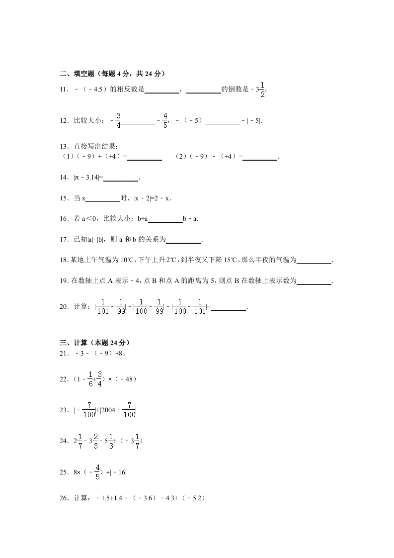 2015-2016学年江苏省宿迁市现代实验学校七年级(上)第一次月考数学试卷一、选择题(每题4分,共24分)1.若a上-a,则有理数a为()A.正数B.负数C.非负数D.负数和零之.已知a和b一正一负,则albl的值为a bA.0B.2C.-2D.根据a、b的值确定3.有一种记分方法:以80分为准,88分记为+8分,某同学得分为74分,则应记为()A.+74分B.-74分C.+6分D.-6分4.下列各数:。(-2号,28,23,0.212121,其中正分数的个数有()7A.1个B.2个C.3个D.4个5.a为有理数,下列判断正确的是()A.-a一定是负数B.a一定是正数C.a一定不是负数D.-a一定是负数6.下列运算正确的是()A.(-4)-(+2)+(-6)-(-4)=-4B.(-4)-(+2)+(-6)-(-4)=-12C.(-4)-(+2)+(-6)-(-4)=-8D.(-4)-(+2)+(-6)-(-4)=-107.己知a>0,b<0,且a+b>0,下列说法错误的是()A.a-b>0 B.a