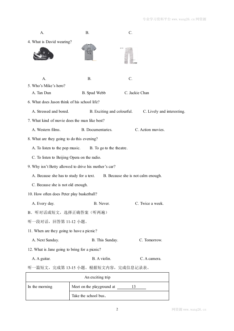 专业学习资料平台mmm.mang26.cn网资源泰兴市实路切级中学初三英语阶段试题2016.11(考试时间:120分钟满分:150分)请注意:1、本试卷分第一部分选择题和第二部分非选择题。2、考生答题前,必须将自己的姓名、考试证号、座位号用黑色或蓝色钢笔或圆珠笔填写在答题卡和答题纸的相应位置,再用2B铅笔将考试证号、科目填涂在答题卡上相应的小框内。第一部分选择题(85分)请注意:考生必须将所选答案的字母标号用2B铅笔填涂在答题卡上相应的题号内,答在试卷上无效。一、听力(20分)A.听第1至10段材料,回答第1至10小题。听两遍)1.Where does Kevin want to go during this Spring Festival?A.B.2.What subject does Timmy like best?9A.B.C3.What will the weather be like tomorrow?网资源mm.Wang26.cn