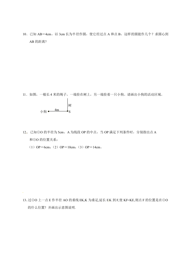 泰兴市西城中学初三数学同步训练()范围:圆(1)命题:王恒君审核:刘海军班级学号姓名成绩家长签字一,填空题1.确定一个圆的条件是和2.如图,⊙0的半径为R,填空:A COAR,OB R,OCR,ODR(第2题)3.矩形ABCD中,AB-6cm,AD-8cm,(I)若以A为圆心,6cm长为半径作⊙A,则点B在⊙A,点C在⊙A一一,点D在⊙A,AC与BD的交点O在⊙A(2)若作⊙A,使B、C、D三点至少有一个点在⊙A内,至少在一点在⊙A外,则⊙A的半径r的取值范围是4.到定点O的距离为2cm的点的集合是以为圆心,为半径的圆。5.正方形的四个顶点在以为圆心,以为半径的圆上。6.若⊙O的半径是4cm,OP=2cm,则点P到圆上各点的距离中最短距离为最长距离为7.己知P点到圆上各点的距离中最短距离为2cm,最长距离为6cm,则⊙0的半径为8.若⊙O所在平面内一点P到⊙O上的点的最大距离为a,最小距离为b(a>b),则此圆的半径为二.解答题9.如图,在△ABC中,∠ACB=90°,CD⊥AB,∠A=30°,AC=3cm,以C为圆心,1.7cm为半径画⊙C,指出点A、B、D与⊙C的位置关系若要⊙C经过点D,则这个圆的半径为多少?
