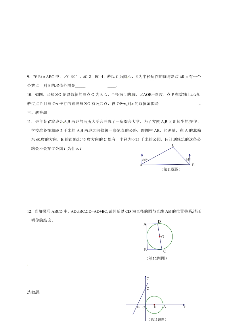 泰兴市西城中学初三数学同步训练()范围:直线与圆的位置(1)命题:陈惠审核:刘海军班级学号姓名成绩家长签字一.选择题1.⊙0的半径为5cm,圆心0到直线L的距离为3cm,则直线L与圆0的位置关系是()A.相交B.相离C.相切D.不能确定2.若直线L与半径为r的⊙O相交,且点O到直线L的距离为5,则r的取值范围是()A.5B.=5C.>5D.r≤53.在平面直角坐标系中,以点(2,3)为圆心,2为半径的圆必定()A.与x轴相离,与y轴相切·B.与x轴、y轴都相离C.与x轴相切,与y轴相离D.与x轴、y轴都相切4.OA平分∠BOC,P是OA上任意一点(O除外),若以P为圆心的⊙P与⊙C相离,那么⊙P与⊙B的位置关系是(.)A.相离B.相切C.相交D.相交或相切5.在平面直角坐标系中有点A(3,4),以A为圆心,5为半径画圆,在同一个坐标系中,直线y=一x与⊙A的位置关系是()A.相离B.相切,C.相交D.以上都有可能二.填空题6.己知圆的直径为16cm,如果一条直线和圆心的距离分别等于(1)7cm(2)8cm(3)9cm,那么这条直线和这个圆的位置关系分别为(1)(2)(3)7.⊙0的最大弦为m,0到直线L的距离为d,若L与⊙0不相离,则d与m的关系为8.如图,直线6与E垂直,垂足为O,AM⊥6于M,AN⊥于N,AM=4,AN=3。以A为圆心,R为半径作⊙A,根据下列条件,确定R的取值范围,(1)若⊙A与两直线无公共点,则R的取值范围为(2)若⊙A与两直线共有一个公共点,则R的取值范围为(3)若⊙A与两直线共有两个公共点,则R的取值范围为(4)若⊙A与两直线共有三个公共点,则R的取值范围为(5)若⊙A与两直线共有四个公共点,则R的取值范围为OP B(第8题图)(第10题图)