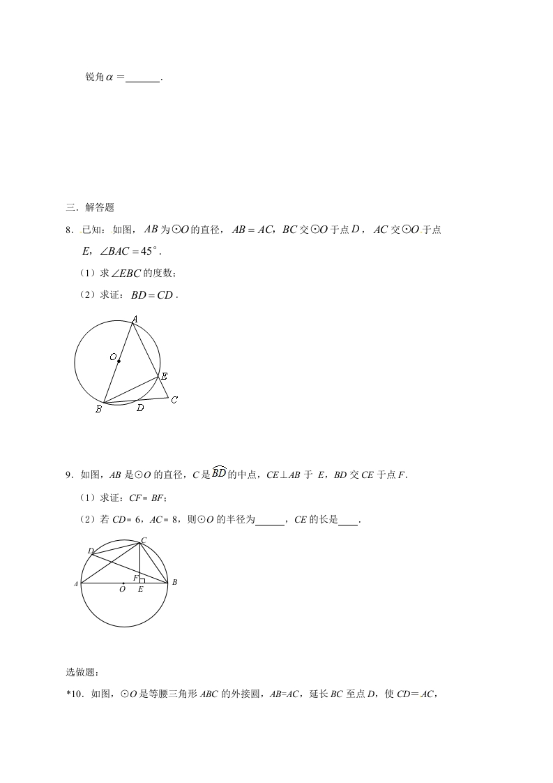 泰兴市西城中学初三数学同步训练(31)范围:圆周角(2)命题、审核:刘海军班级学号姓名成绩家长签字一.选择题1.如图,⊙O的直径AB=4,点C在⊙O上,∠ABC=30°,则AC的长是()A.1B.5C.5D.22.下列命题中,正确的命题个数有()①顶点在圆周上的角是圆周角:②圆周角的度数等于圆心角度数的一半:③90°的圆周角所对的弦是直径:④圆周角相等,则它们所对的弧也相等。A.1个B.2个.C.3个D.4个3.如图,点A、B、P在⊙O上,且∠APB=50°若点M是⊙O上的动点,要使△ABM为等腰三角形,则所有符合条件的点M有()A.1个B.2个C.3个D.4个4.如图,己知AB是⊙O的直径,C是⊙O上的一点,连结AC,过点C作直线CD⊥AB交AB于点D,E是OB上的一点,直线CE与⊙O交于点F,连结AF交直线CD于点G,AC=2√2,则AG·AF是(,)R12C.16D.80.C(第1趣图)(第3趣图)(第4题图)二.填空题5.如图,AB为⊙O的直径,点C,D在⊙O上.若∠AOD=30°,则∠BCD的度数是6.如图,AB是⊙O的直径,点C在⊙O上,∠BAC=30°,点P在线段OB上运动.设∠ACP=x,则x的取值范围是*7.如图⊙O的半径为1cm,弦AB、CD的长度分别为√2cm,lcm,则弦AC、BD所夹的0。O P