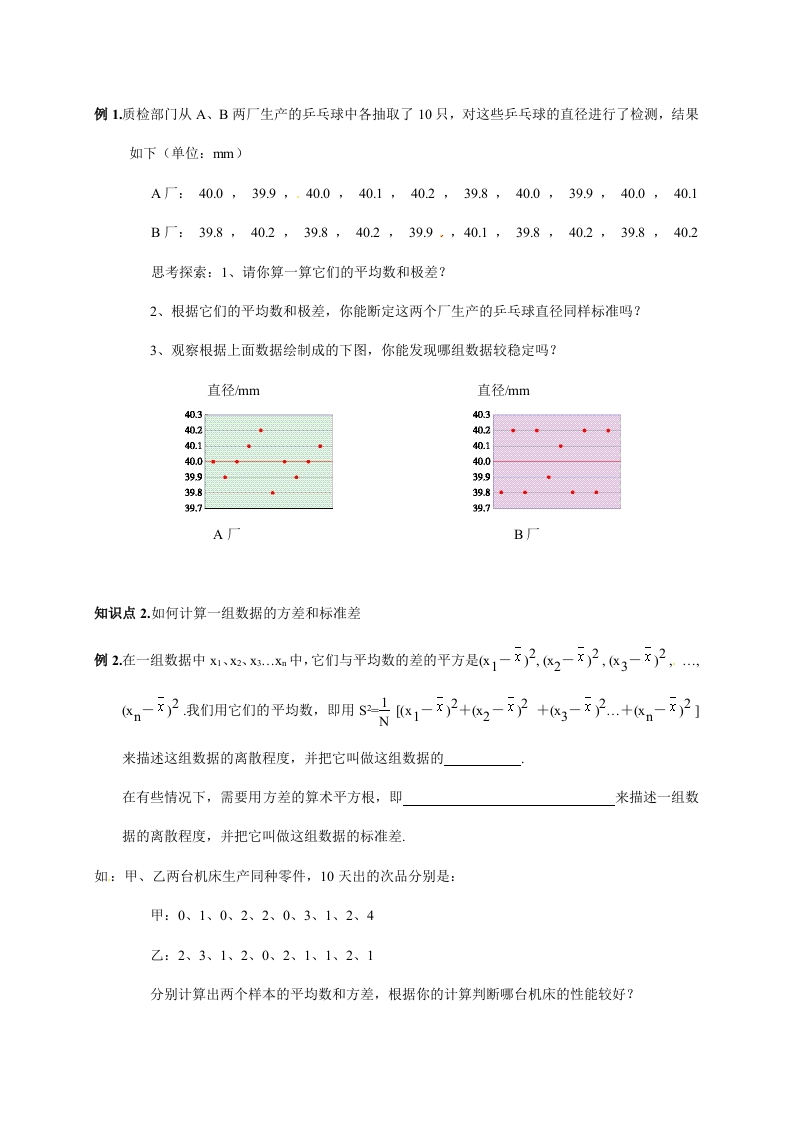 初三数学教案【教学目标】1.经历刻画数据离散程度的探索过程,感受表示数据离散程度的必要性2.掌握方差和标准差的概念,卉计算方差和标准差,理解它们的统计意义.3.经历探索极差、方差的应用过程,体会数据波动中的极差、方差的求法时以及区别,积累统计经验【教学过程】一、创设情境,引入概念1.我们知道极差只能反映一组数据中两个之间的大小情况,而对其他数据的波动情况不敏感2.描述一组数据的离散程度可以采取许多方法,在统计中常采用先求这组数据的,再求这组数据与」的差的的平均数,用这个平均数来衡量这组数据的波动性大小3.设在一组数据X1,X2,X3,X4,Xw中,各数据与它们的平均数x的差的平方分别是(X1-x)2,(X2x)2,(Xx)2,,(XX)二,那么我们求它们的平均数,即用S2-4.一组数据方差的算术平方根叫做这组数据的5.方差是描述一组数据的特征数,可通过比较其大小判断波动的大小,方差说明数据越稳定,6.为什么要这样定义方差?7.为什么要除以数据的个数?8.标准差与方差的区别和联系?二、例题讲解知识点1.探究计算数据方差和标准差的必要性