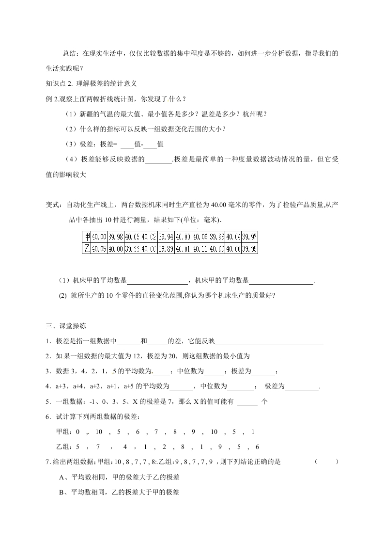 初三数学教案【教学目标】1.经历刻画数据离散程度的探索过程,感受表示数据离散程度的必要性,2.掌握极差的概念,理解其统计意义3.了解极差是刻画数据离散程度的一个统计量,并在具体情景中加以应用.【教学过程】一、复习回顾1.我们己经学习了用表示一组数据的集中程度,但发现对一些数据的研究,必须了解一组数据的程度2.为了体现一组数据的离散程度,我们可以用这组数据的米表示3.一组数据中与的差叫做这组数据的极差组数据的极差越大,表示离散程度一组数据的极差越小,表示离散程度二、问题探究知识点1.感受表示数据离散程度的必要性例1.人体舒适度预报也叫做体感温度预报,就是以舒适指数的形式对“舒适”进行数字化定义,用来反映不同的温度环境下人体的舒适感觉.下表显示的新疆和杭州两地,在一天内不同时段的气温情况:00040080012.00160020.00新疆10°c14°c20°c24c19°c16c杭州20°c22c23c25c23c21°c(1)分别求出两地的平均气温,并在图中表示平均气温的直线:030020151510时间345时间点新抗州(2)同学们大学毕业后,你会选择那所城市居住?为什么?
