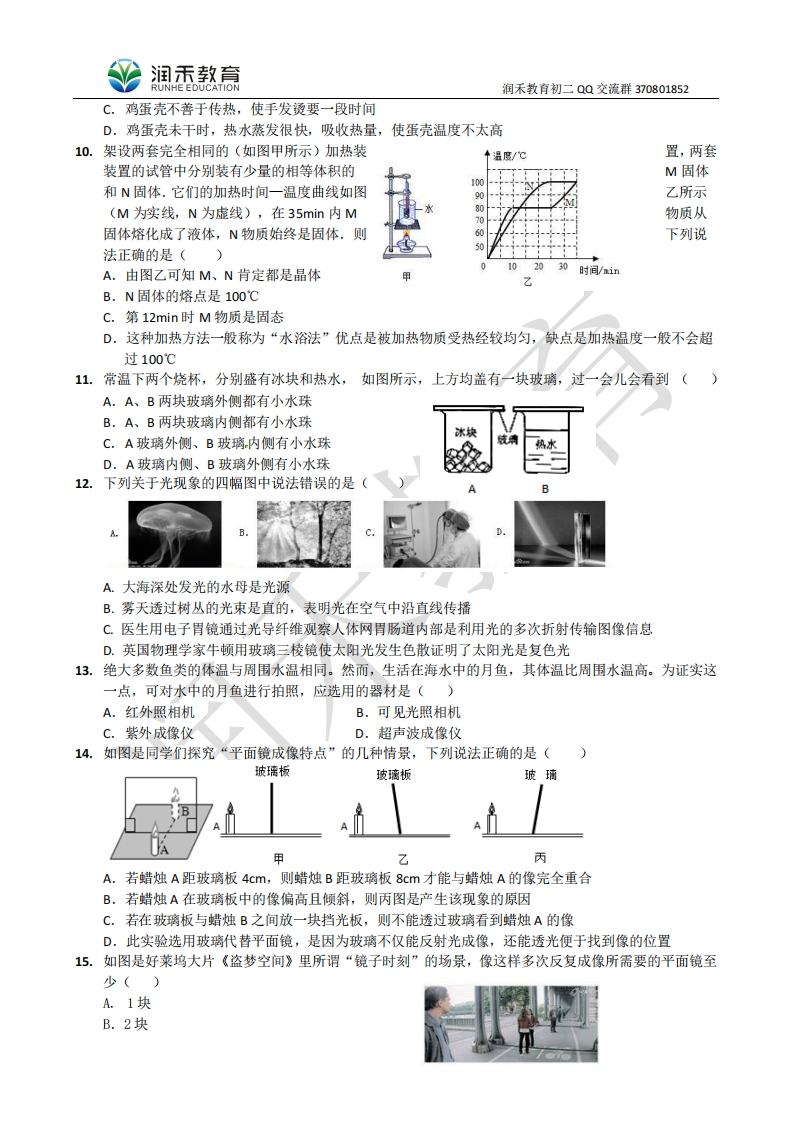 润本教意润禾教育初二Q0Q交流群370801852无锡市北塘区2015-2016学年度第一学期期中考试八年级物理试题卷2015.11一、选择题(每题仅有一项符合题意,每题2分,共30分)1.将拨响的琴弦用手一按,响声立即消失原因是()A.琴弦的振动停止了B.声音被手吸收了C.琴弦的振动变小了D.声音被手挡住了2.下列图中,主要描述声音能够传递能量的是()A.探测海深B.敲瓶底火焰摇动C.回声定位D.超声波探查下列对声现象四个实验的分析,正确的是()黑丙TA.图甲正在发声的音叉把静止的乒乓球弹开,说明声音的传播需要介质B.图乙抽取玻璃罩内的空气,听到罩内铃声减小,说明声音可以在真空中传播C.图丙把耳朵贴在桌面上轻敲桌子,听到敲击声说明声音是由物体的振动产生D.8个相同的玻璃瓶中灌入不同高度的水,敲击时会听到它们发出音调不同4.下列有关温度的说法中你认为最符合实际的是()A.人体的正常体温为35℃B.冰箱冷冻室的温度约为5℃C.无锡盛夏中午室外温度可达42℃D.无锡最低气温可达零下30℃5.下列事例表示的自然现象中,属于凝固的是()A.花瓣上的露珠B.隆冬河面上的冰C.雪山下的流水D.草叶上的霜6.冰雕是一种独具魅力的艺术,有时冰雕作品也要在夏天或在气温较高的南方地区巡展,为了防止冰雕熔化,陈列冰雕作品的房间温度要足够低,但是每多降温1℃,制冷系统的耗电量就要增加很多.为了既不使冰雕熔化又能节约用电,房间温度控制的最佳数值是()A.5℃B.1CC.-5℃D.-10℃7.下列事例中的“小水珠”的形成需要吸收热量的是(ABD青草上的露珠冰凌上滴下的水山间的薄雾壶嘴上方目出的白气8.冬天雨雪过后,停在户外的汽车的前窗玻璃上常结有一层冰,要想除去这些冰,下列做法不可取的是()A.喷洒盐溶液B.用硬的纸质物体直接清除C.启动车子,打开热风,吹汽车前窗玻璃D.将沸水直接浇在车前窗玻璃上9.刚从水中捞出的熟鸡蛋在手中不太烫,待蛋壳表面的水干后,便觉得很烫,这是因为()A.鸡蛋的内部温度很高,有热逐渐散发B.水的温度低,鸡蛋壳的温度高