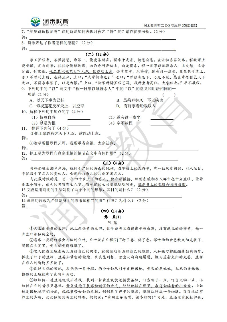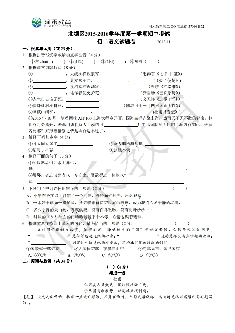 润玉教意润禾教有初二QQ交流群370801852北塘区2015-2016学年度第一学期期中考试初二语文试题卷2015.11一、积与运用(共23分)1.根据拼音写汉字或给加点字注音(4分)①焦zhuo()②qi跷(③f0闲()④吮吸()2.根据课文内容默写(8分)①大渡桥横铁索寒。(毛泽东《七律长征》)②其实味不同。(《晏子使楚》)③夜泊秦淮近酒家。(杜牧《泊秦淮》)④化作春泥更护花。(龚自珍《己亥杂诗》)⑤人生自古谁无死,(文天祥《过零丁洋》)⑥僵卧孤村不自哀,(陆游《十一月四日风雨大作》)⑦国破山河在,(杜甫《春望》)⑧2015年10月,随着网球ATP100上海大师赛开幕,四海高手齐聚上海,然而天下无不散的筵席,他们终将会离开,若套用唐代诗人王勃的《》中那句脍炙人口的“海内存知己,天涯若比邻”来形容惜别之情是再合适不过了。3.解释下列加点字(4分)①齐人固善盗乎②圣人非所与熙也③语时了不悲④弦既不调4.翻译下面的句子(3分)①所以然者何?水土异也。译:②晏婴,齐之习辞者也,今方米,吾欲辱之,何以也?译:5.下列句子中词语使用错误的一项是(2分)A.小宁在语文课上答错了一个问题,弄得面红耳赤,声名狼藉。B.一本好书就如一座堡垒,抵御着来自花花世界的喧嚣,成为我们心灵宁静的港湾。C.多么宁静的天山哟,万籁俱寂,没有百鸟啾啾,没有树叶沙沙…D.讨厌的雨季!外面的雨唏唏嘘嘘下个不停,心情也跟着糟糕。6.揣摩文意在横线上填入的内容,最为恰当的一项是(2分)()当时间变得越发珍贵,消磨时间、降低速度的“闲”便越发奢侈。久远年代的诗词里,4”是何等悠远辽阔的心境:“”说的是那么清幽雅趣的意境:则宛如一幅隽永的水墨画,定格在那花朵静绽的刹那。①闲敲棋子落灯花②人闲桂花落,夜静春山空③海鸥无事,闲飞闲宿A.②0③B.③0②C.③②0D.①③2二、阅读与欣赏(共34分)(一)(4分)漫成一首杜甫江月去人只数尺,风灯照夜欲三更。沙头宿乌联拳静,船尾跳鱼拨刺鸣。【注】:安史之乱开始,杜甫一直流亡颠沛,后弃官西行,入蜀定居成都,这首诗是杜甫寓居巴蜀时期写的