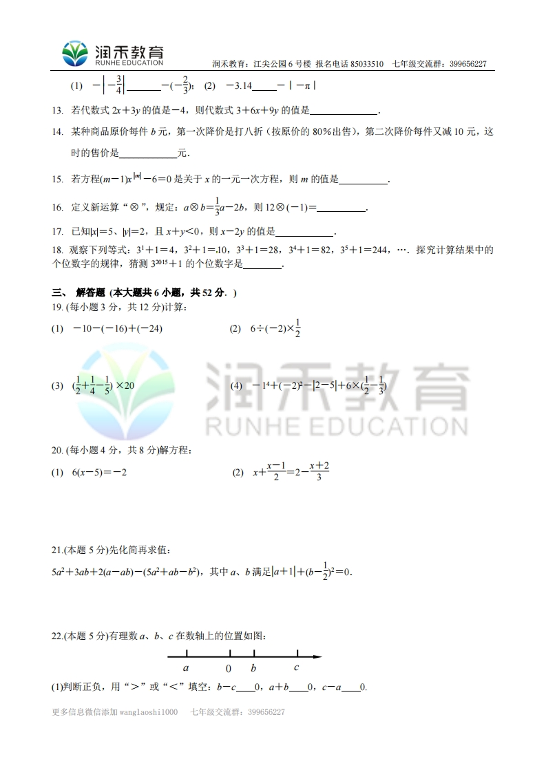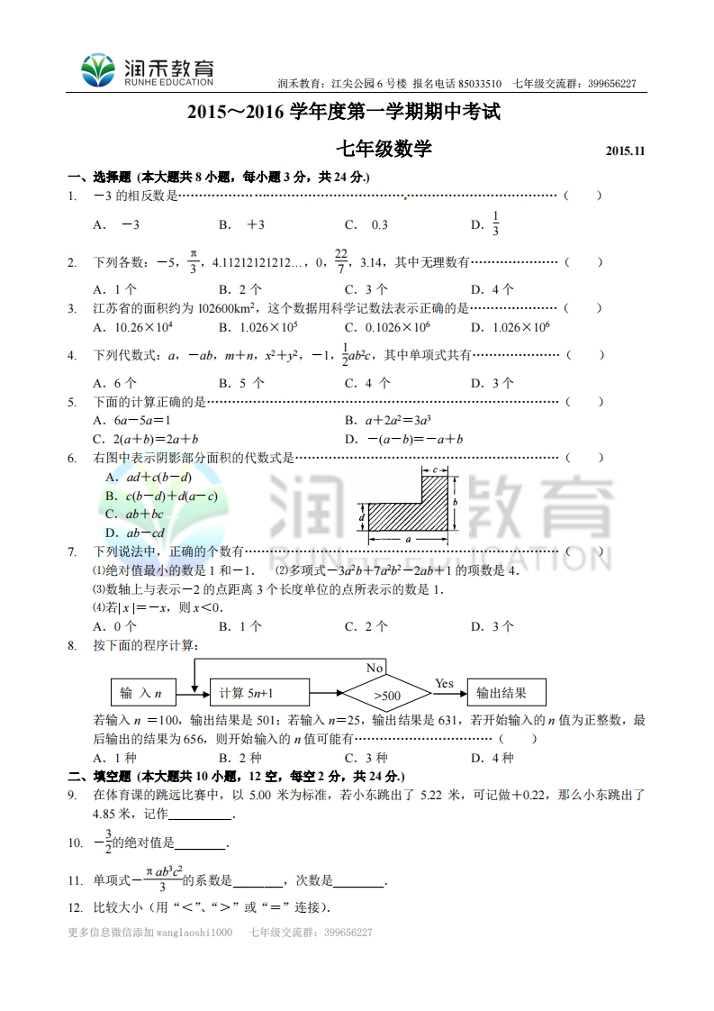 润无教育RUNHE EDUCATION润禾教育:江尖公园6号楼报名电话85033510七年级交流群:3996562272015~2016学年度第一学期期中考试七年级数学2015.11一、选择题(本大题共8小题,每小题3分,共24分)1.一3的相反数是……A.-3B.+3C.0.3D.2.下列各数:-5号,411212121212,0,号3.14,其中无理数有…(22A.1个B.2个C.3个D.4个3.江苏省的面积约为102600km2,这个数据用科学记数法表示正确的是…(A.10.26×10B.1.026×105C.0.1026×10D.1.026×1094.下列代数式:a,-ab,m十n,x2+2,-1,b2c,其中单项式共有…(A.6个B.5个C.4个D.3个5.下面的计算正确的是…(A.6a-5a=1B.a+2a2=3aC.2(a+b)=2a+bD.-(a-b)=-a+b6.右图中表示阴影部分面积的代数式是…A.ad+db-d)B.c(b-d)+d(a-c)C.ab+bc润教育D.ab-cd轮对德量小药数整个和有®多项式0中70心2a61的数是T⊙7.下列说法中,正确的个数有…(3)数轴上与表示一2的点距离3个长度单位的点所表示的数是1.(4)若x=一x,则x<0.A.0个B.1个C.2个D.3个8.按下面的程序计算NoYes输入n计算5+1>500输出结果若输入n=100,输出结果是501:若输入n=25,输出结果是631,若开始输入的n值为正整数,最后输出的结果为656,则开始输入的n值可能有…()A.1种B.2种C.3种D.4种二、填空题(本大题共10小题,12空,每空2分,共24分)9.在体育课的跳远比赛中,以5.00米为标准,若小东跳出了522米,可记做+022,那么小东跳出了4.85米,记作10.-的绝对值是」11.单项式-abc3一的系数是一,次数是12.比较大小(用“<”、“>”或“=”连接)更多信息微信添加wanglaoshi1000七年级交流群:399656227
