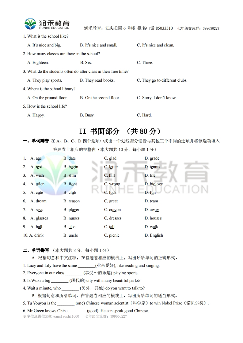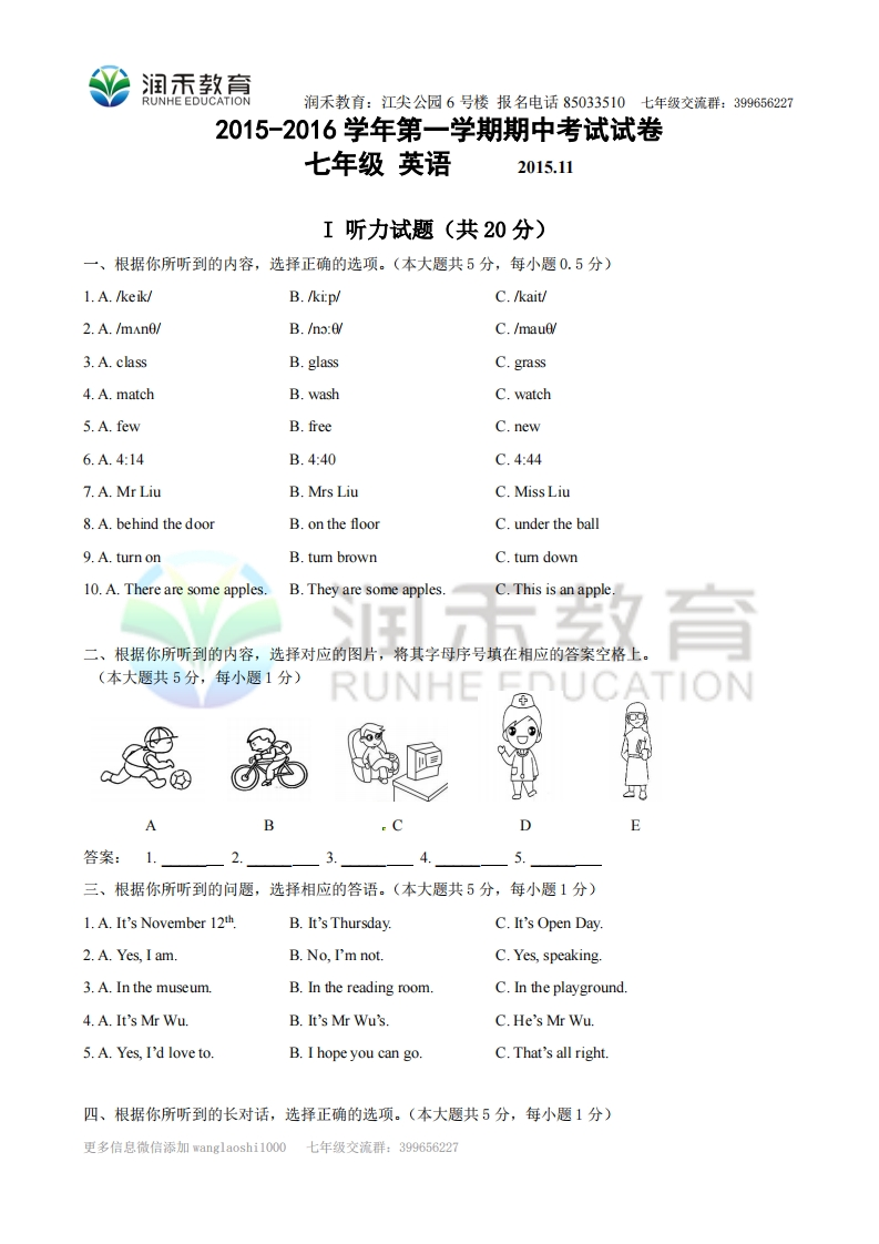 润无教育RUNHE EDUCATION润禾教育:江尖公园6号楼报名电话85033510七年级交流群:3996562272015-2016学年第一学期期中考试试卷七年级英语2015.11I听力试题(共20分)一、根据你所听到的内容,选择正确的选项。(本大题共5分,每小题0.5分)1.A./keik/B./ki:p/C./kait/2.A./mn0/B./n3:0/C./maue/3.A.classB.glassC.grass4.A.matchB.washC.watch5.A.fewB.freeC.new6.A.4:14B.4:40C.4:447.A.Mr LiuB.Mrs LiuC.Miss Liu8.A.behind the doorB.on the floorC.under the ball9.A.turn onB.tum brownC.tum down10.A.There are some apples.B.They are some apples.C.This is an apple.二、根据你所听到的内容,选择对应的图片,将其字母序号填在相应的答案空格上。(本大题共5分,每小题1分)RUNHECATION答案:1.4三、根据你所听到的问题,选择相应的答语。(本大题共5分,每小题1分)1.A.It's November 12th.B.It's Thursday.C.It's Open Day.2.A.Yes,I am.B.No,I'm not.C.Yes,speaking.3.A.In the museum.B.In the reading room.C.In the playground.4.A.It's Mr Wu.B.It's Mr Wu's.C.He's Mr Wu.5.A.Yes,I'd love to.B.I hope you can go.C.That's all right.四、根据你所听到的长对话,选择正确的选项。(本大题共5分,每小题1分)更多信息微信添加wanglaoshi1000七年级交流群:399656227