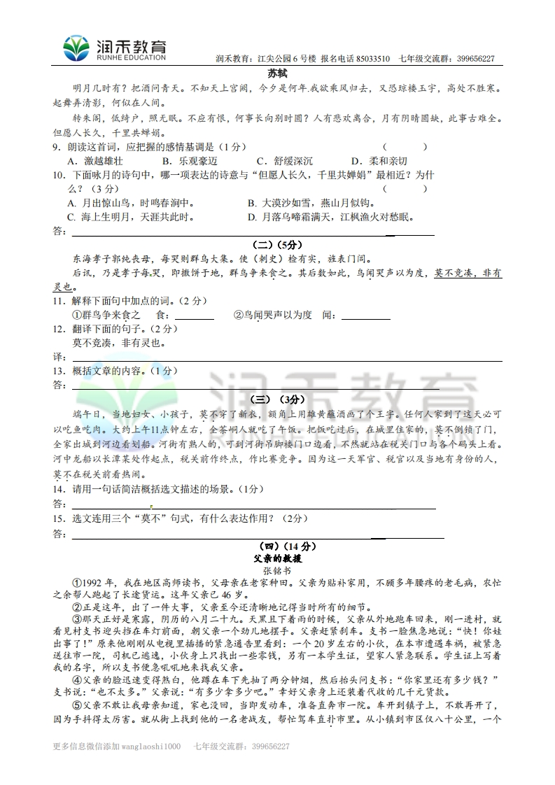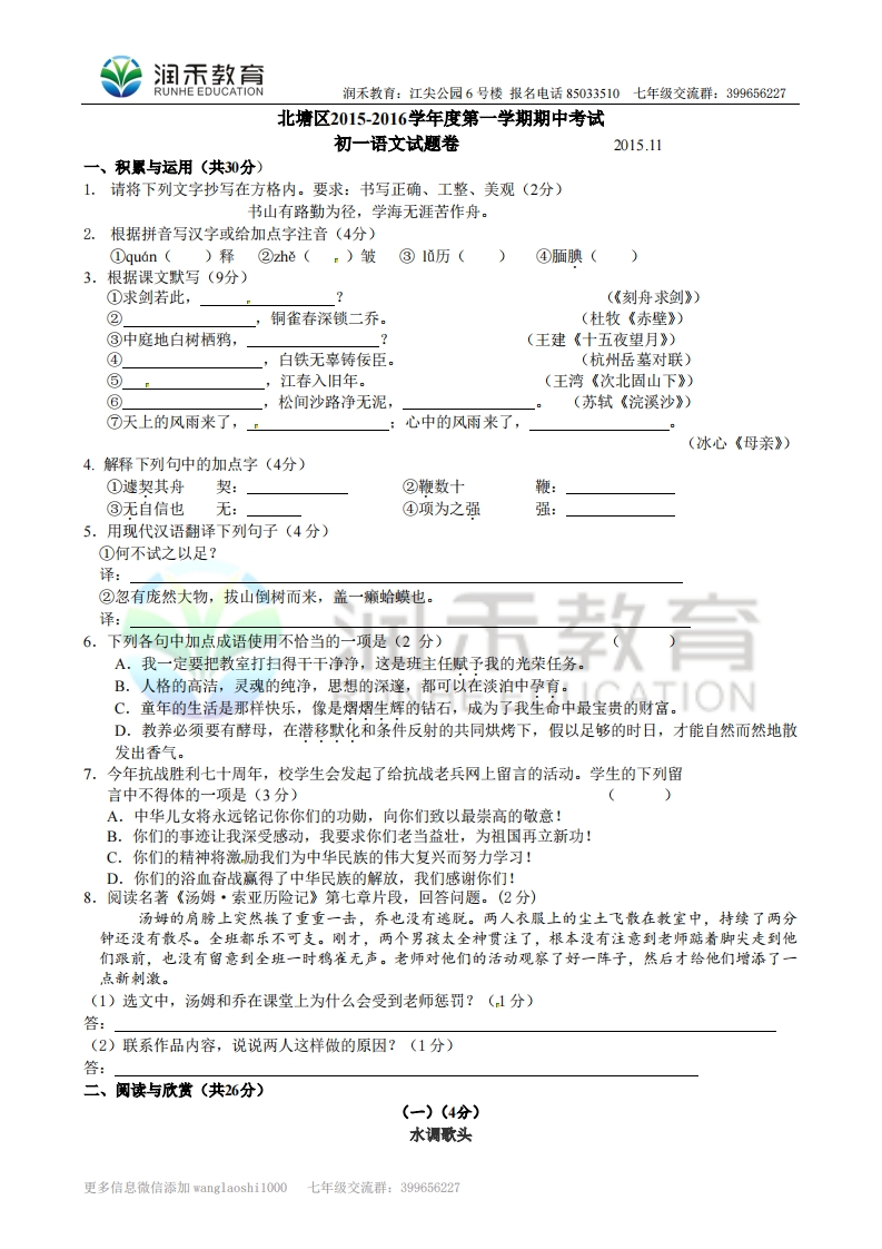 润无教育RUNHE EDUCATION润禾教育:江尖公园6号楼报名电话85033510七年级交流群:399656227北塘区2015-2016学年度第一学期期中考试初一语文试题卷2015.11一、积累与运用(共30分)1.请将下列文字抄写在方格内。要求:书写正确、工整、美观(2分)书山有路勤为径,学海无涯苦作舟。2.根据拼音写汉字或给加点字注音(4分)①qun()释②zhě(。)皱③1ǚ历()④腼腴()3.根据课文默写(9分)①求剑若此,(《刻舟求剑》)②铜雀春深锁二乔。(杜牧《赤壁》)③中庭地白树栖鸦,(王建《十五夜望月》)④白铁无辜铸佞臣。(杭州岳墓对联)⑤江春入旧年。(王湾《次北固山下》)⑥松间沙路净无泥,(苏轼《浣溪沙》)⑦天上的风雨来了,心中的风雨来了,(冰心《母亲》)4.解释下列句中的加点字(4分)①遽契其舟契:②鞭数十鞭:③无自信也无:④项为之强强:5.用现代汉语翻译下列句子(4分)①何不试之以足?译:②忽有庞然大物,拔山倒树而来,盖一癞蛤蟆也。译:二士6.下列各句中加点成语使用不恰当的一项是(2分)A.我一定要把教室打扫得干干净净,这是班主任赋子我的光荣任务。B.人格的高洁,灵魂的纯净,思想的深邃,都可以在淡泊中孕育。。童年的生活是那样快乐,像是熠烟生棒的钻石,成为了我生命中最宝贵的财富。○D.教养必须要有酵母,在潜移默化和条件反射的共同烘烤下,假以足够的时日,才能自然而然地散发出香气。7.今年抗战胜利七十周年,校学生会发起了给抗战老兵网上留言的活动。学生的下列留言中不得体的一项是(3分)A.中华儿女将永远铭记你你们的功勋,向你们致以最崇高的敏意!B.你们的事迹让我深受感动,我要求你们老当益壮,为祖国再立新功!C.你们的精神将激励我们为中华民族的伟大复兴而努力学习!D.你们的浴血奋战赢得了中华民族的解放,我们感谢你们!8.阅读名著《汤姆·索亚历险记》第七章片段,回答问题。(2分)汤姆的肩膀上突然挨了重重一击,乔也没有逃脱。两人衣服上的尘土飞散在教室中,持续了两分钟还没有散尽。全班都乐不可支。刚才,两个男孩太全神贯注了,根本没有注意到老师踮着脚尖走到他们跟前,也没有留意到全班一时鸦雀无声。老师对他们的活动观察了好一阵子,然后才给他们增添了一点新刺激。(1)选文中,汤姆和乔在课堂上为什么会受到老师惩罚?(1分)答:(2)联系作品内容,说说两人这样做的原因?(1分)答:二、阅读与欣赏(共26分)(一)(4分)水调歌头更多信息微信添加国anglaoshi1000七年级交流群:399656227