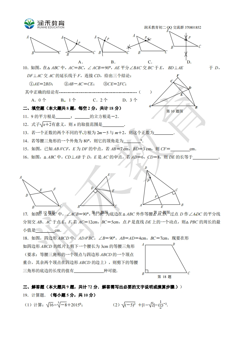润本教息润禾教育初二QQ交流群3708018522015年秋学期期中考试试题2015.11++++++初二数学(说明:本试卷满分120分,考试时间:100分钟)一、选释题(本大题共10愿,每小题3分,共计30分)1.以下分别为绿色食品、回收、节能、节水标志,其中是轴对称图形的是一AB2.下列实数:2、反、号、0.1010101、7、x,其中无理数的个数为A.1B.2C.3D.4:3.下列说法正确的是以A.(-3)2的平方根是3B.V16=±4C.1的平方根是1D.8的立方根是24.等腰三角形的两边长分别为2cm和7cm,则其周长为++A.11cmB.13cmC.16cmD.11cm或16cm5.在下列各组条件中不能说明△ABC2△DEF的是A.AB=DE,∠B=∠E,∠C=∠FB.AC=DF,.BC=EF,∠A=∠DC.AB=DE,∠A=∠D,∠B=∠ED.AB=DE,BC=EF,AC=DF6.如图,BC的垂直平分线分别交AB、BC于点D和点E,连接CD,AC=DC,∠B=25°则∠ACD的度数是A.50°B.609C.80°D.100°d c A BD第6趣图第7题图:7.如图,在数轴上表示1、V的点分别为A、B,点B关于点A的对称点为C,则C点所表示的是郭A.2-2B.V2-2C.1-V2D.V2-18.一个钝角三角形的两边长为5、12,则第三边可以为一A.11B.13C.15D.17:9.如图,己知△ABC(AB
