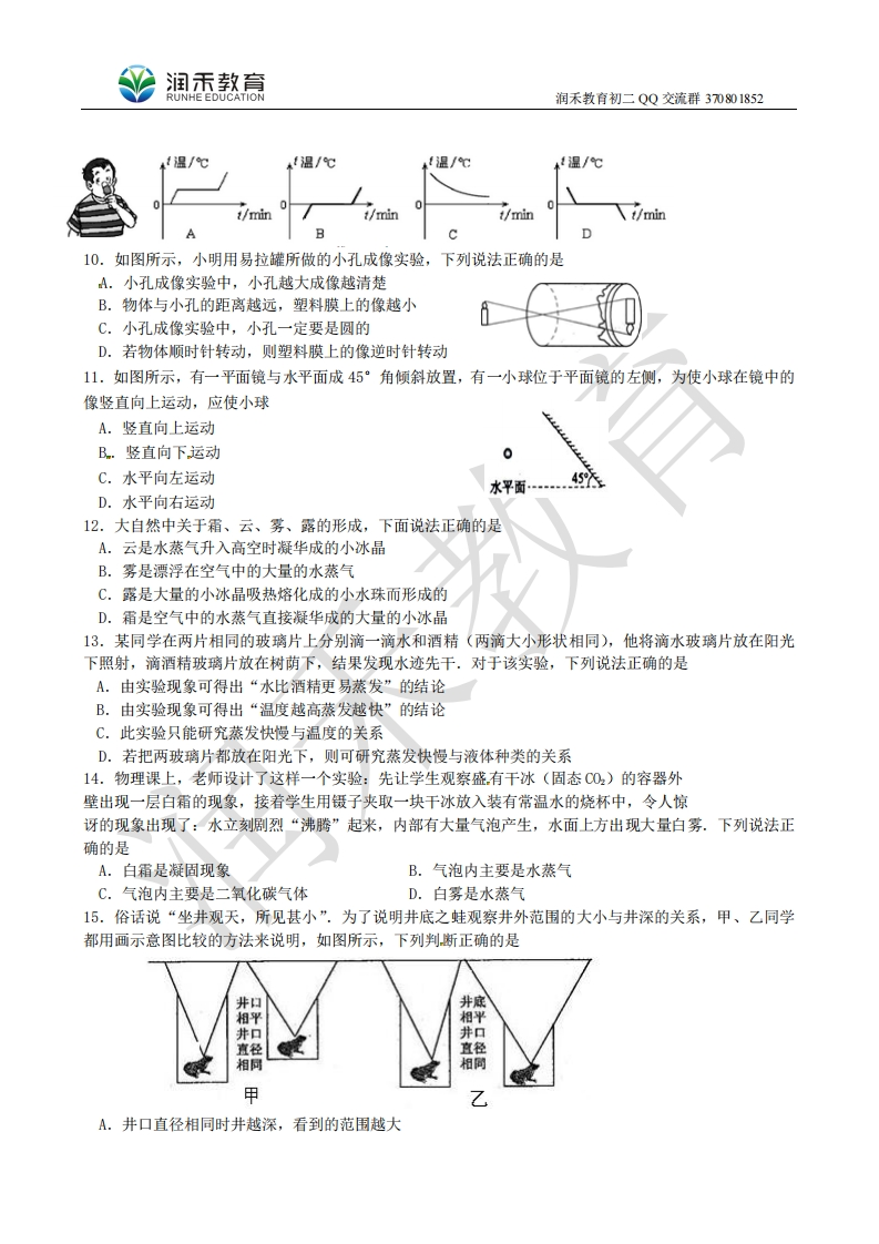 润教息润禾教有初二QQ交流群3708018522015年秋学期期中考试试题初二物理2015.11(本试卷满分100分考试时间90分钟)一、选择题(本题共15小题,每题2分,共30分。每题给出的四个选项中只有一个选项正确)1.关于声音的产生与传播,下列说法正确的是A.声音可以在真空中传播B.声音是由物体的振动产生的C.声音的传播不需要时间D.敲鼓时,听到鼓声,鼓面不振动2.城市里有“超声波洁牙”美容店,超声波之所以能洁牙,是因为A.超声波是清洁剂B.超声波能传递去污信息C.超声波能发生反射D.超声波引起的振动使污垢脱落3.如图所示,小明将悬挂的轻质小球紧靠音叉,用小锤轻敲和重敲音叉时,小球弹开的角度不同.比较角度的大小是为了探究A.声音产生的原因B.响度和振幅的关系C.音调和频率的关系D.声音的传播是否需要时间4.下列几个温度值中,你认为最符合实际的是A.我们现在考场内的温度约为50℃B.洗澡时淋浴水温约为70℃C.健康成年人的腋下温度约为37℃D.冰箱保险室中矿泉水的温度约为-5℃5.绝大多数鱼类的体温与周围水温相同.然而,生活在海水中的月鱼,其体温比周围水温高.为证实这一点,可对水中月鱼进行拍照,应选用的器材是A.红外照相机B.可见光照相机C.紫外光成像仪D.超声波成像仪6.无论是严冬还是酷暑,在使用冷暖空调的房间窗户玻璃表面,有时都会出现小水珠,那么,关于这种现象的说法中正确的是A.夏天,小水珠附着在玻璃的内表面,冬天,小水珠附着在玻璃的外表面B.夏天,小水珠附着在玻璃的外表面,冬天,小水珠附着在玻璃的内表面C.无论冬夏,小水珠都是出现在玻璃的内表面D.无论冬夏,小水珠都是出现在玻璃的外表面7.关于光的反射,下列说法不正确的是A.入射光线与反射面的夹角为15°时,反射角为75B.入射角增大5°时,反射光线与入射光线的夹角也增大5C.入射光线靠近法线时,反射光线也靠近法线D.镜面反射遵守光的反射定律,漫反射也遵守光的反射定律8.以下研究方法与研究通过乒乓球跳动的高度反映出振幅的大小的方法相同的是A.研究光时将它分成可见光和不可见光B.研究光的直线传播时引入光线C.研究材料隔声性能时用同一声源,并在声源周围包上厚度相同的材料D.通过温度计内液体热胀冷缩程度来判断温度高低9.中央电视台二套“真假实验室”探究,刚从冰箱冷冻室拿出冰棍贴紧舌头,舌头会被“冻”在冰棍上,这时舌头的水发生了某种物态变化,与其对应的图像是