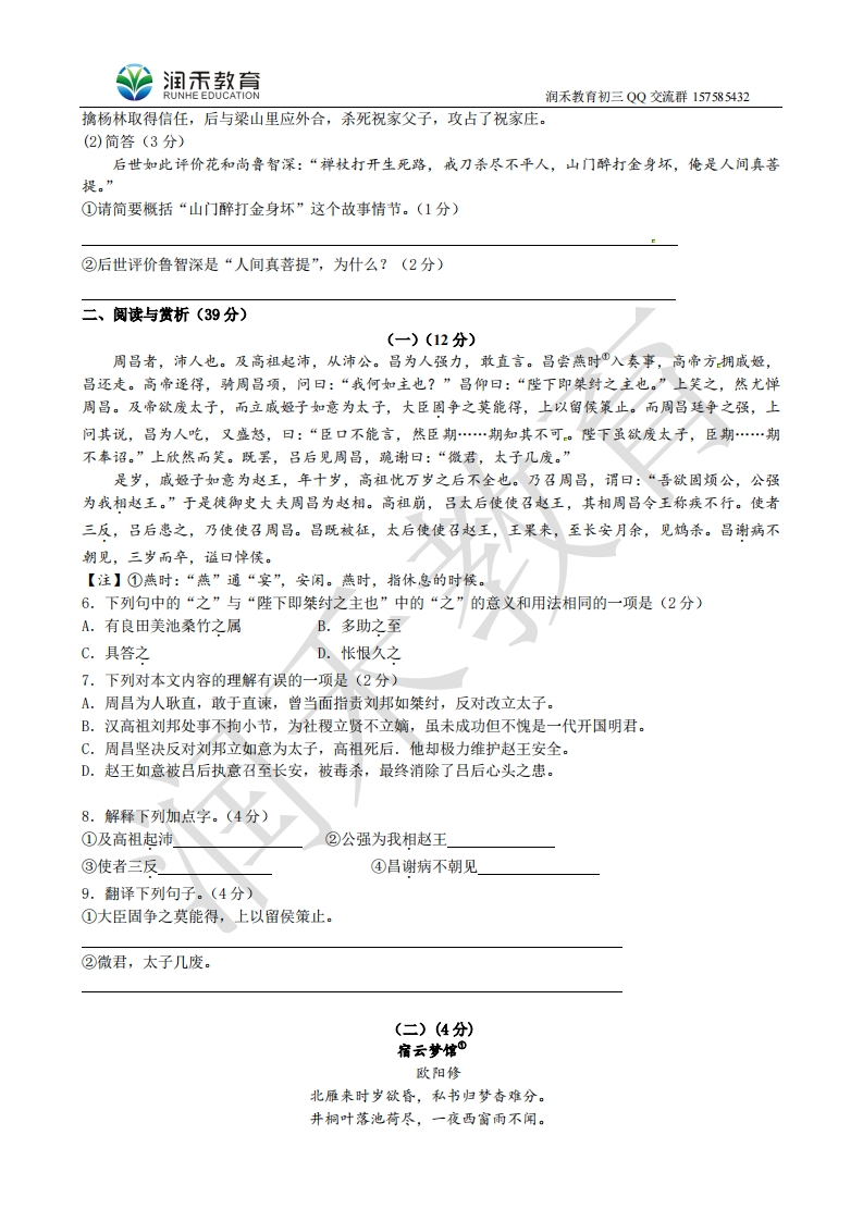 润不教急润禾教有初三QQ交流群1575854322015年秋学期期中考试试卷初三语文2015.11注意事项:1.本卷分试题和答卷两部分,所有答案一律写在答卷上。2.本学科考试时间为150分钟,满分为130分。一、积累与运用(25分)1.根据课文默写。(10分)①君子好逑。(《诗经·关雎》)②兼葭凄凄,。(《诗经·兼葭》)③固国不以山溪之险。(孟子《得道多助,失道寡助》)④且壮士不死即已,死即举大名耳,!(司马迁《陈涉世家》)⑤土地平旷,(陶渊明《桃花源记》)⑥窥谷忘反。(吴均《与朱元思书》)⑦春风不度玉门关。(王之涣《凉州词》)⑧晓战随金鼓,(李白《塞下曲》)⑨蒌蒿满地芦芽短,。(苏轼《惠崇(春江晚景》)⑩绿杨烟外晓寒轻,。(宋祁《木兰花》)2.下列各组词语中读音和书写都有错误的一项是(3分)A.端详(xing)万簌(ldi)俱寂B.阔绰(chuò)融会(hui)贯通C.胆怯(què)消声匿(ni)迹D.殷(yin)红言简意赅(gai)3.下列句子中加点的词语使用不正确的一项是(3分)A.满江画着的片片墨色山影,使人恍惚沉进恬静的梦境。B.人格的高洁、灵魂的纯净、思想的深邃都可以在淡泊中孕育。C.战乱使很多叙利亚人无家可归,无以为生,兀兀穷年,被迫沦为难民逃往欧洲。D.林则徐虎门销烟的壮举家喻户晓,但他在兴修水利方面的功绩却鲜为人知。4.对下面文段中加点词的解释有错误的一项是(3分)水皆缥碧,千丈见底。游鱼细石,直视无碍。急湍甚箭,猛浪若奔。夹岸高山,皆生寒树:负势竞上,互相轩遂;争高直指,千百成峰。A.甚:胜过。B.奔:奔马。C.竞:争着。D.轩邈:高远。5.名著阅读(6分)(1)下列有关《水浒传》的内容表述正确的一项是(3分)A.林冲是《水浒传》中塑造得最好的人物之一,金圣叹称之为“上上人物”。林冲被逼上梁山前经历了误入白虎堂、倒拔垂杨柳、活捉扈三娘、风雪山神庙、雪夜上梁山等事。B.武松为兄报仇怒杀西门庆和潘金莲:发配孟州途中在十字坡酒店结识孙二娘:后又醉打蒋门神,大闹飞云浦,血溅鸳鸯楼:为躲避缉捕夜走蜈蚣岭,痛杀王道人。C,鲁达为金老父女凑盘缠时把自己身上带的五两银子都给了金老,而史进却只“去身边摸出二两来银子”,鲁达嫌他“不爽利”,干脆不要他的银子,丢还与他,给他一个难堪。D,三打祝家庄时,孙立利用与祝家庄师爷是同门兄弟的关系,率梁山好汉假冒官军进入祝家庄。孙立假