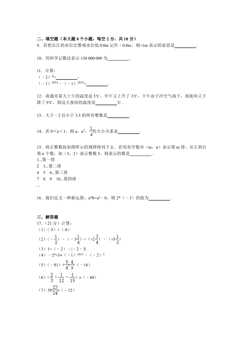 2015-2016学年江苏省无锡市滨湖中学七年级(上)月考数学试卷(10月份)一、选择题(本大题共8小题,共24分.)1.甲、乙、丙三地的海拔高度分别为20m、-15m和-10m,那么最高的地方比最低的地方高()A.5m B.10m C.25m D.35m2.下列各对数中互为相反数是()A.-(+5)和+(-5)B.-(-5)和+(-5)C.-(+5)和-5D.+(-5)和-53.-2的倒数是()A.-2B.2C.D.24.数轴上与原点距离小于3的整数点有()A.2个B.3个C.4个D.5个5.若a+b<0,ab<0,则下列判断正确的是()A.a,b都是正数B.a,b都是负数C.a,b异号且负数的绝对值大D.a,b异号且正数的绝对值大26.下列各数:-(+2,-32,(-),-(-1)2015,-1-3中,负数的个数是()个.A.2B.3C.4D.57.下列说法正确的个数是()①绝对值最小的数是0②一个数的绝对值的相反数一定是负数③数轴上原点两侧的数互为相反数④互为相反数的两个数的绝对值相等。A.1个B.2个C.3个D.4个8.将下表从左到右在每个小格子中都填入一个整数,使得其中任意三个相邻格子中所填整数之和都相等,则第2014个格子中的数位(3a6c1A.3B.2C.0D.-1