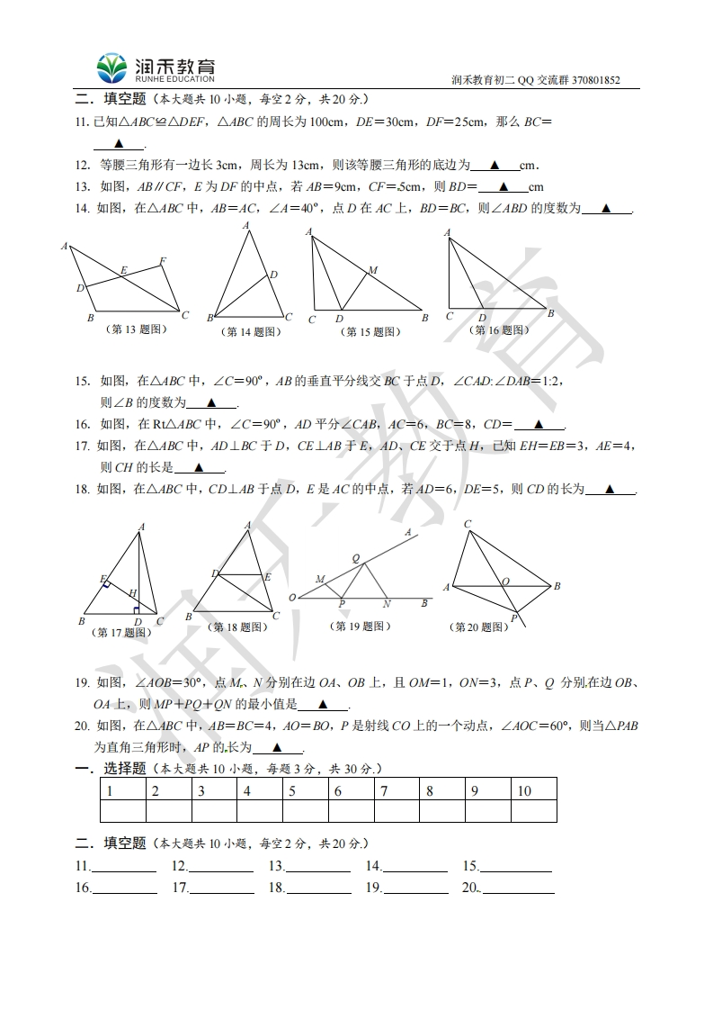 润本熬急润禾教育初二QQ交流群3708018522015~2016学年第一学期期中试卷初二数学2015.11(考试时间:100分钟满分:100分)一.选择题(本大题共10小题,每题3分,共30分)1.下面有4个汽车标志图案,其中是轴对称图形的有....…(▲)①②③④A.1个B.2个C.3个D.4个2.到一个三角形三个顶点的距离都相等的点是这个三角形的.……….A.三条中线的交点B.三条角平分线的交点C.三条高的交点D.三条边的垂直平分线的交点3.青青同学把一张长方形纸折了两次,如图,使点A、B都落在DG上,折痕分别是DE、DF,则∠EDF的度数为…(▲)A.60B.75°C.90D.120°4.等腰三角形中有一个角等于0°,则它的底角度数是……(▲)A.700B.559C.40°或559D.70°或55°5.如图,∠CAB=∠DBA,再添一个条件,不一定能判定△ABC≌△BAD的是.(▲)A.AD=BCB.∠1=∠2C.AC=BDD.∠C=∠D(第3趣图)(第5趣图)(第8题图)(第9题图)(第10趣图)6.在Rt△ABC中,∠C=90°,a、b、c分别为∠A、∠B、∠C的对边,已知a:b=3:4,c=10,则△ABC的面积为……(▲)A.24B.12C.28D.3.07.△ABC中,∠A,∠B,∠C的对边分别为a、b、c,下列说法中错误的是....(▲)A.如果∠C一∠B=∠A,则△ABC是直角三角形,且∠C=90°:B.如果c2=2-b,则△4BC是直角三角形,且∠C=90°:C.如果(c十a)(c一a)=b,则△ABC是直角三角形,且∠C=90°:D.如果∠A∠B:∠C=3:2:5,则△ABC是直角三角形,且∠C=90°8.如图,在△ABC中,CD⊥AB于点D,BE⊥AC于点E,F为BC的中点,DE=5,BC=8,则△DEF的周长是…………(▲)A。21B.18C.13D.159.如图,己知Rt△ABC中,∠C=90°,∠A=30°,在直线BC或AC上取一点P,使得△PAB是等腰三角形,则符合条件的P点有…………(▲)A.5个B.6个C.7个D.8个10.如图,在△ABC中AD是∠A的外角平分线,P是AD上一动点且不与点A、D重合,记PB十PC=a,AB十AC=b,则a、b的大小关系是....m.…(▲)A.a>bB.a=bC.a