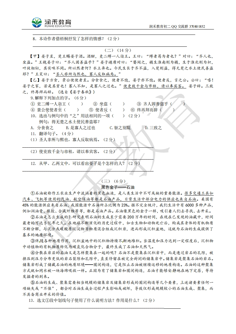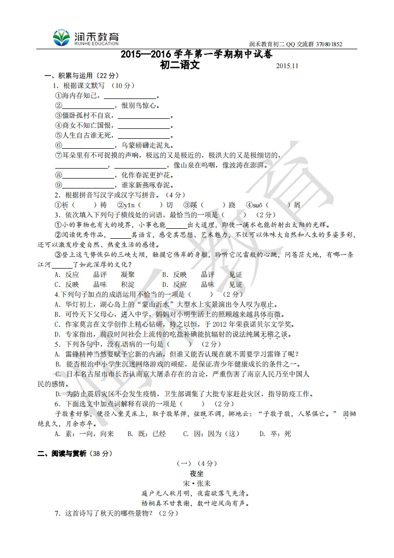 润玉教意UNHE EDUCA润禾教育初二QQ交流群3708018522015一2016学年第一学期期中试卷初二语文2015.11一、积累与运用(22分)1.根据课文默写(10分)①海内存知己,②恨别鸟惊心。③僵卧孤村不自哀,④商女不知亡国恨,⑤人生自古谁无死,©乌蒙磅礴走泥丸。⑦耳朵里有不可捉摸的声响,极远的又是极近的,极洪大的又是极细切的,,像山泉在鸣咽,像波涛在澎湃。⑧化作春泥更护花。⑨谁家新燕啄春泥。2.根据拼音写汉字或汉字写拼音。(4分)①祈()祷②y1n()切③蹊()跷④suǒ()屑3.依次填入下列句子横线处的词语,最恰当的一项是()(2分)①小的事物也有大的境界,小事也能出大道理,即使一滴水也能折射出太阳的光辉。②阅读优秀作品,其语言,感受其思想、艺术魅力,不仅可以体味大自然和人生的多姿多彩,还可以激发珍爱自然、热爱生活的感情。③登上这气势恢弘的三峡大坝,触摸它伟岸的身躯,聆听它沉雷般的心跳,问苍茫大地,有哪一条江河了如此深厚的文化?A.反应品评凝聚B.反映品评见证C.反映品味积淀D.反应品味见证4.下列句子加点的成语运用不恰当的一项是()(2分)A.华灯初上,湖心岛上的“蒙山沂水”大型水上实景演出令人叹为观止。B.可怜天下父母心,进入中学,妈妈对小明生活上的照顾越来越具体而微。C.作家莫言在文学创作上精心钻研,持之以恒,于2012年荣获诺贝尔文学奖D.专家指出,前段时间社会上流传的吃盐补碘能抗辐射的说法纯属无稽之谈。5.下列各句中,没有语病的一句是()(2分)A.雷锋精神当然要赋予它新的内涵,但谁又能否认现在就不需要学习雷锋了呢?B.能否根治中小学生沉迷网络游戏的顽症,是保证青少年健康成长的条件之一。C.日本名古屋市市长否认南京大屠杀存在的言论,严重伤害了南京人民乃至中国人民的感情。D.为防止震后灾区不会发生疫情,卫生部调集了大批专家赶赴灾区,指导防疫工作。6.下面选文中加点词解释有误的一项是()(2分)子敬素好琴,便径入坐灵床上,取子敬琴弹,弦既不调,掷地云:“子敬子敬,人琴俱亡。”因恸绝良久,月余亦卒。A.素:一向,向来B.既:己经C.因:因为(这)D.卒:死二、阅读与赏析(38分)(一)(4分)夜坐宋·张耒庭户无人秋月明,夜霜欲落气先清。梧桐真不甘衰谢,数叶迎风尚有声。7.这首诗写了秋天的哪些景物?(2分)