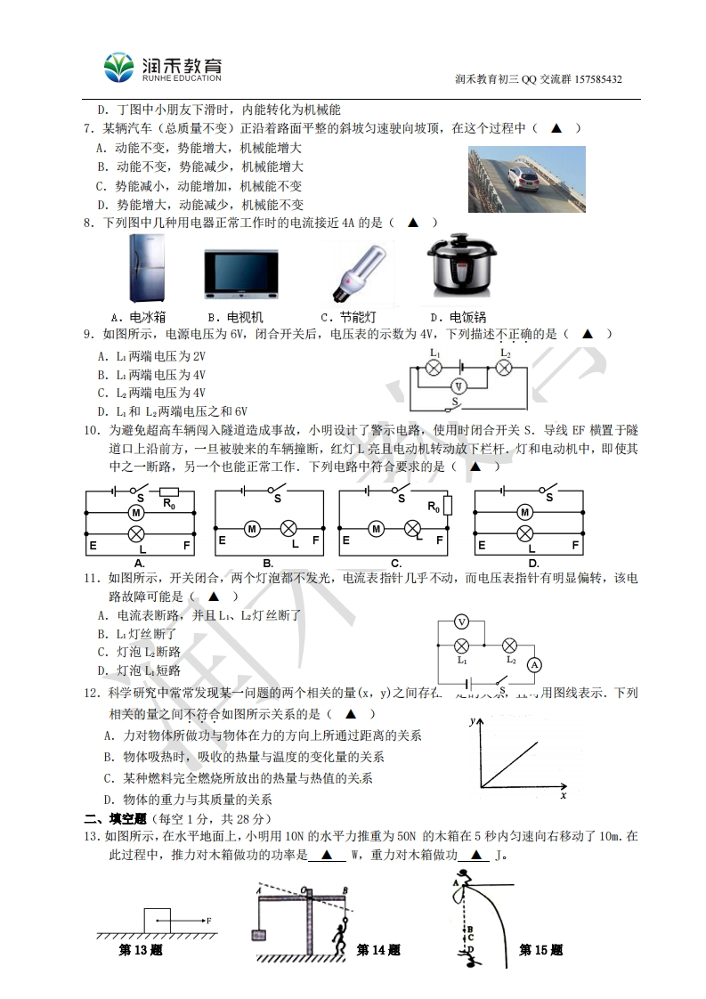 润玉教急润禾教有初三QQ交流群1575854322015-2016学年第一学期期中试卷初三物理2015.11本试卷g取10/kg一、选释题(每小题只有一个选项符合题意,每题2分,共24分)1.如图所示,下列器件中属于费力杠杆的是(▲)①核桃夹②船桨③手推车④碗夹A.①②B.②③C.②④D.③④2.如图所示,用下列机械提起同一重物,不计机械自重和摩擦,最省力的是(B3.在如图所示的四种情境中,人对物体做功的是(A.B.D.A.小海通过滑轮组拉着重物不动B.小阳用力推汽车,汽车没动C.小文提着水桶沿水平路面匀速前进D.小丽用力搬起箱子4.一个大人和一个小孩分别将5块完全相同的砖运到二楼,如图/我只要用我用了说法正确的10s355是(▲)A,大人对砖做的功比小孩对砖做的功多名目B.大人对砖做的功比小孩对砖做的功少C.大人对砖做功的功率一定比小孩对砖做功的功率大D,大人对砖做功的功率一定比小孩对砖做功的功率小5.下列说法正确的是(▲)A.温度高的物体,内能一定大B.做功和热传递是改变物体内能的两种方式C.比热容与物体吸收或放出的热量有关D.热值与燃料的燃烧情况有关6.对于图中所示的四幅图,下列说法中正确的是(▲)甲内A.甲图中软木塞飞出时,管内水蒸气的内能增加B.乙图中一定质量的冰在熔化过程中,温度不变,但内能增加C.丙图中活塞向上运动是内燃机的做功冲程