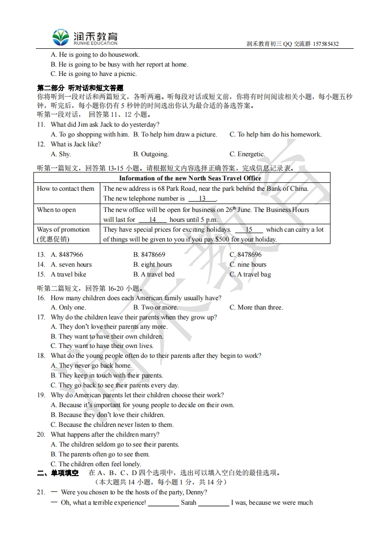 润玉教意润禾教有初三QQ交流群1575854322015-2016学年第一学期期中试卷初三英语考试时间:120分钟2015.11第1卷(客观题共50分)一、听力测试(本大题共20小题,每小题1分,共20分)第一部分听对话回答问题本部分共有10道小题,每小题你将听到一段对话,每段对话听两遍。在听每段对话前,你将有5秒钟的时间阅读题目:听完后,你还有5秒钟的时间在选择你认为最合适的答案。1.What day is it today?星期三星期四星期五2.What does the girl want to borrow?3.What does the woman prefer?What's the girl's animal sign?AB5.How did her uncle arrive from Beijing?A.By train.B.By car.C.By plane.6.Why do the classmates choose Cindy as the monitor?A.Because she is clever and hardworking.B.Because she is helpful and confident.C.Because she is organized and outgoing.7.When will Mrs.Brown take the medicine next time?A.This afternoon.B.This evening.C.Tomorrow.8.How does the girl feel now?A.Stressed.B.Sad.C.Excited.9.How much should the woman pay?A.200am.B.300 yuan.C.4002uam.10.How is the man going to spend his weekend?