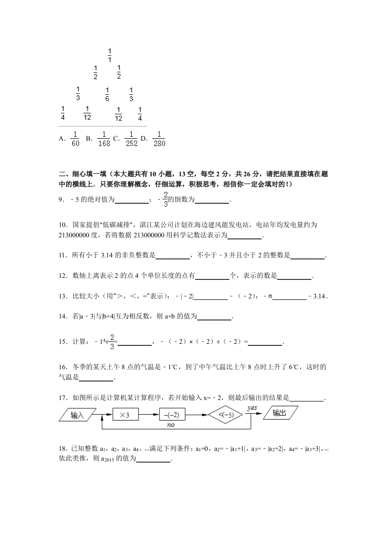 2015-2016学年江苏省无锡市东绛实验学校七年级(上)月考数学试卷(10月份)一、精心选一选(本大题有8小题,每题3分,共24分.在每题所给出的四个选项中,只有一项是符合题意的把所选项前的字母代号填在题后的括号内相信你会选对的!)1.某地某天的最高气温是8℃,最低气温是-2℃,则该地这一天的温差是()A.-10℃B.-6℃C.6℃D.10℃2.把(+5)-(+3)-(-1)+(-5)写成省略括号的和的形式是()A.-5-3+1-5B.5-3-1-5C.5+3+1-5D.5-3+1-53.下列各对数中互为相反数的是()A.-(+3)和+(-3)B.-(-3)和+(-3)C.-(-3)和-3引D.+(-3)和-1-34在-1号12,-20,0,。(-5,-+3中,负数的个数有()A.2个B.3个C.4个D.5个5.如果a、b互为相反数,c、d互为倒数,m的绝对值为2,那么ab+m3-cd的值为()A.7或-9B.7C.-9D.5或-76.计算:21-1=1,22-1=3,23-1=7,24-1=15,25-1=31,…归纳各计算结果中的个位数字规律,猜测22013-1的个位数字是()A.1B.3C.7D.57.已知:bc0,且Ma+bl+c,abcL,当ab,c取不同的值时,M有()abcA.惟一确定的值B.3种不同的取值C.4种不同的取值D.8种不同的取值8.如图所示的数码叫“莱布尼茨调和三角形”,它们是由整数的倒数组成的,第n行有个数,且两端的数均为,每个数是它下一行左右相邻两数的和,则第8行第3个数(从左往右数)为()