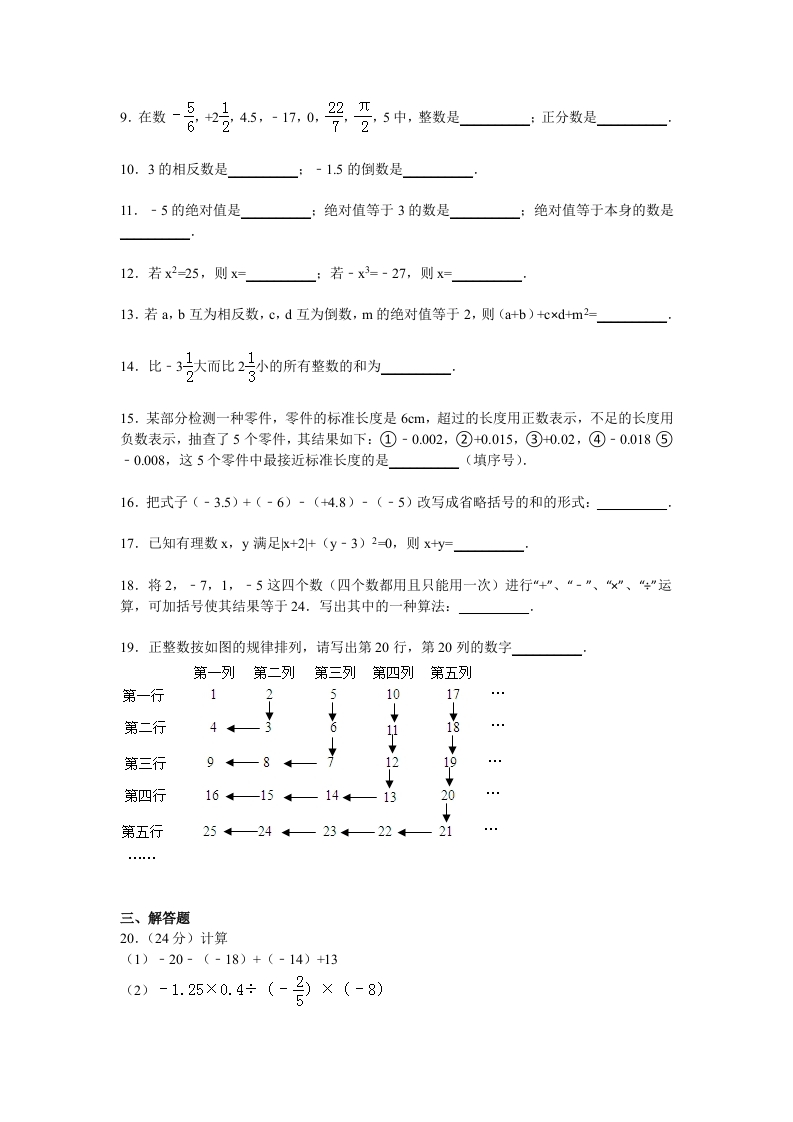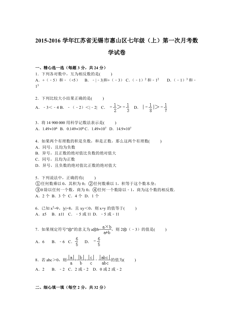 2015-2016学年江苏省无锡市惠山区七年级(上)第一次月考数学试卷一、精心选一选(每题3分,共24分)1.下列各对数中,互为相反数的是()A.+(-5)和-(+5)B.-|-3引和+(-3)C.(-1)2和-12D.(-1)3和-132.下列比较大小结果正确的是(A-3K-4B.(-2)<-2C.-号>-号D.1->-月3.将14900000用科学记数法表示是(A.1.49×105B.0.149×108C.1.49×107D.14.9×1074.如果两个有理数的积是负数,和是正数,那么这两个有理数()A.同号,且均为负数B.异号,且正数的绝对值比负数的绝对值大C.同号,且均为正数D.异号,且负数的绝对值比正数的绝对值大5.下列说法中,正确的有()①任何数乘以0,其积为0:②任何数乘以1,积等于这个数本身:③0除以任何一个数,商为0:④任何一个数除以-1,商为这个数的相反数.A.2个B.3个C.4个D.1个6.己知x2-9,y=8,且xy<0,则x+y的值等于()A.±5B.11C.-5或11D.-5或-117.如果规定符号“⑧的意义为a8baX,则28(-3)的值是()atb、A.6B.-6C.5D.-658.若abc>0.则al,Ibl,Icl.abcl的值为a b c abc)A.2B.-2C.2或-2D.0或2或-2二、细心填一填(每空2分,共32分)