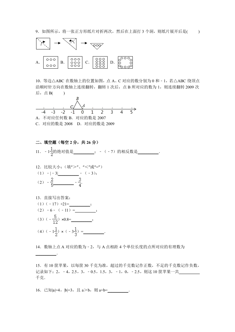 2015-2016学年江苏省无锡市江阴市山观二中七年级(上)月考数学试卷(10月份)一、选择题(每题2分,共20分)1.如果+10%表示“增加10%”,那么“减少8%”可以记作()A.-18%B.-8%C.+2%D.+8%2.下列几对数中,互为相反数的是()A和-075B.和-5C.元和-314D.和-33.某市2015年元旦的最高气温为2℃,最低气温为-8℃,那么这天的最高气温比最低气温高()A.-10℃B.-6℃C.6℃D.10℃4.把-6-(+7)+(-2)·(-9)写成省略加号和的形式后的式子是()A.-6-7+2-9B.-6-7-2+9C.-6+7-2-9D.-6+7-2+95.在012(-3》.538,-号中,正整数的个数(A.1个B.2个C.3个D.4个6.如果k-3+y+10,那么x-y等于()A.-4B.4C.2D.-27.下列说法:①有理数的绝对值一定是正数:②一个数的绝对值的相反数一定是负数:③互为相反数的两个数,必然一个是正数,一个是负数:④互为相反数的绝对值相等:⑤m的相反数是-3.14:⑥任何一个数都有它的相反数.其中正确的个数有()A.0个B.1个C.2个D.3个8.a、b为两个有理数,若a+b<0,且ab>0,则有()A.a,b异号B.a、b异号,且负数的绝对值较大C.a<0,b<0D.a>0,b>0