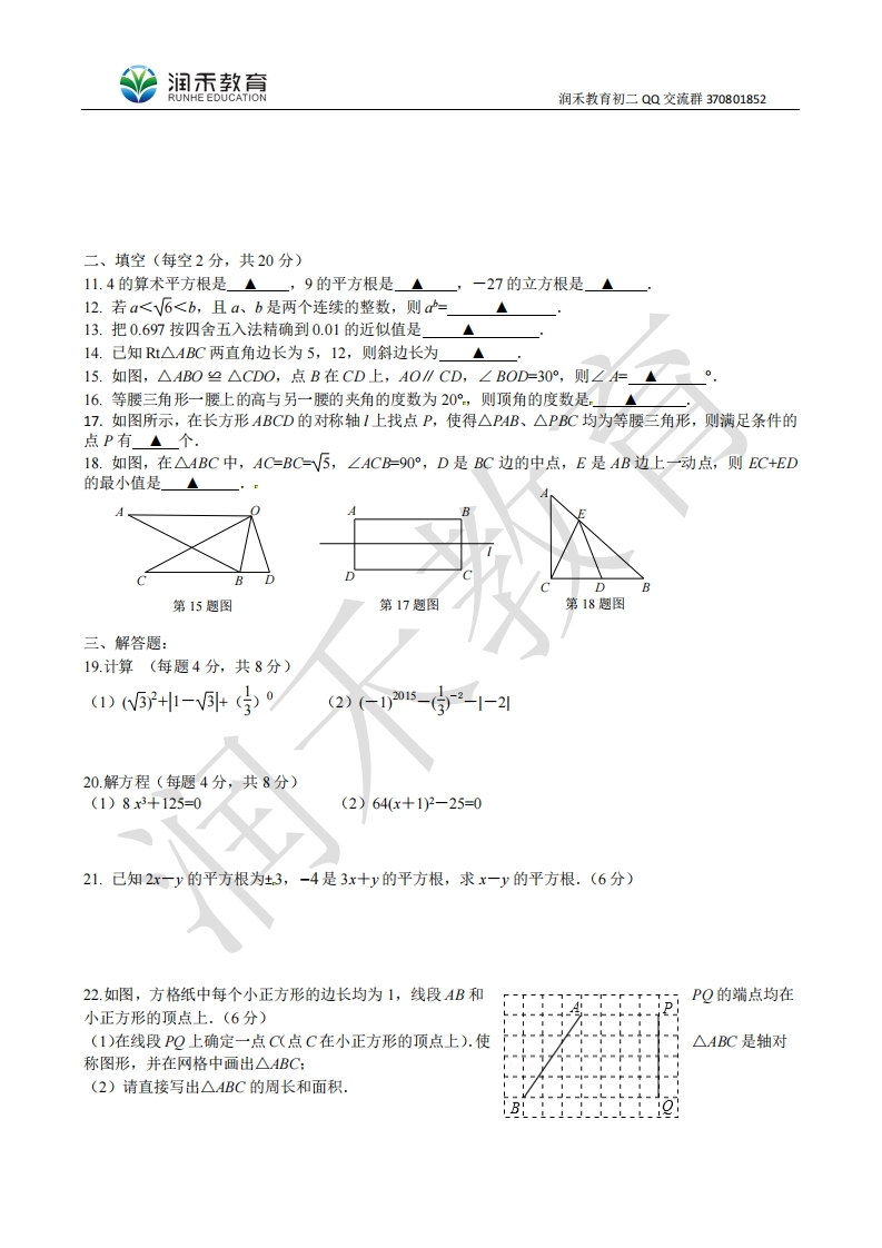 润禾教育初二QQ交流群3708018522015-2016学年度第一学期初二数学期中试卷测试时间:100分钟满分:120分一、选择题:(每题3分,共30分)1在以下绿色食品、回收、节能、节水四个标志中,是轴对称图形的是…(D2.在实数0、π、、号、反、-√中,无理数的个数有A.1个B.2个C.3个D.4个3.己知一个等腰三角形的两边长分别是2和4,则该等腰三角形的周长为·(▲)A.8或10B.8C.10D.6或124.如图,△ABC≌△DEF,∠A=50°,∠C=30°,则∠E的度数为A.30°B.50°C.60°D.100°5.如图,在方格纸中,以AB为一边作△ABP,使之与△ABC全等,从P1,P2,P3,P4四个点中找出符合条件的点P,则点P有……(▲)A.1个B.2个C.3个D.4个6.如图,△ABC中,AB=AC=12,BC=8,AD平分∠BAC交BC于点D,点E为AC的中点,连接DE,则△CDE的周长是…(▲)A.20B.1216D.13第4趣图第5题图第6题图7.如图,OP平分∠AOB,PD⊥OA于点D,点Q是射线OB上一个动点,若PD=2,则PQ的最小值为…(▲)A.PO<2B.PO=2C.PO>2D.以上情况都有可能8.己知实数α,b在数轴上的位置如图所示,下列结论错误的是…(▲)a古0十b→A.1