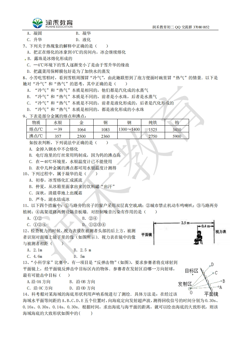 润玉教意润禾教有初二QQ交流群3708018522015年无锡市南长区期中试卷(初二物理)物理试题本试卷分试题和答题卡两部分,所有答案一律写在答题卡上.试卷满分为100分.注意事项:1.答卷前,考生务必用0.5毫米黑色墨水签字笔将自己的姓名、准考证号填写在答题卡的相应位置上.2.答选择题必须用2B铅笔将答题卡上对应题目的正确选项涂黑.如需改动,用橡皮擦干净后再选涂.3.答主观题必须用0.5毫米黑色墨水签字笔作答,答案写在答题卡各题目指定区域内相应位置上,如需改动,先划掉原来的答案,然后再写上新的答案.不准使用铅笔和涂改液.不按以上要求作答的答案无效4.考生必须保持答题卡的整洁.考试结束后,将试题卷和答题卡一并交回.一、选择题(共14小题,每小题2分,共28分。每小题给出的四个选项中只有一个正确)1、关于声音的说法正确的是()A.声音是由物体振动产生的B.声音在真空中的传播速度是340m/sC.乐器发出的声音一定不是噪声D.声波不能传递能量2、如图所示,用悬挂着的乒乓球接触正在发声的音叉,乒乓球会被多次弹开,这个实验是用来探究()A.声音能否在真空中传播B.声音产生的原因C.音调是否与频率有关D.声音传播是否需要时间3、“会说话的汤姆猫”是一款手机宠物类应用(如图).游戏时,当你对着它讲话,它就会模仿你的腔调学舌,非常好玩.针对这一现象,下面说法正确的是()A.手机发出声音时,是由于手机中的猫的声带振动而产生的B.“汤姆猫”和人说出的话虽然语义相同,但两种声音的音色不同,所以能够区别出来C.当对着手机用很小的音量说话时,“汤姆猫”没有反应,说明需要发出足够高的频率才能使手机接收到声音信号D.你发出的和手机发出的声音都是通过空气传到人的耳朵中,但传播速度各不相同4、下列事例中,能用光的直线传播来解释的是()A.坐井观天,所见甚小B.从湖水中看到岸边树木的“倒影”C.教室里的黑板“反光”D.雨过天晴,天空出现美丽的彩虹5、关于光现象,下列说法中正确的是()A.城市建筑大量使用玻璃幕墙,给人以美观,对环境没有任何危害和影响B.漫反射的光线虽然杂乱无章,但每条光线仍遵循光的反射定律C.人能够看到本身不发光的物体是因为人眼发出了光D.红花呈现出红色的原因是它只吸收红光,反射其他颜色的色光6、在严寒的冬季,小满到滑雪场滑雪,恰逢有一块空地正在人工造雪.他发现造雪机在工作过程中,不断将水吸入,并持续从造雪机的前方喷出“白雾”,而在“白雾”下方,己经积了厚厚的一层“白雪”,如图所示.对于造雪机在造雪过程中,水这种物质发生的最主要的物态变化,下列说法中正确的是()