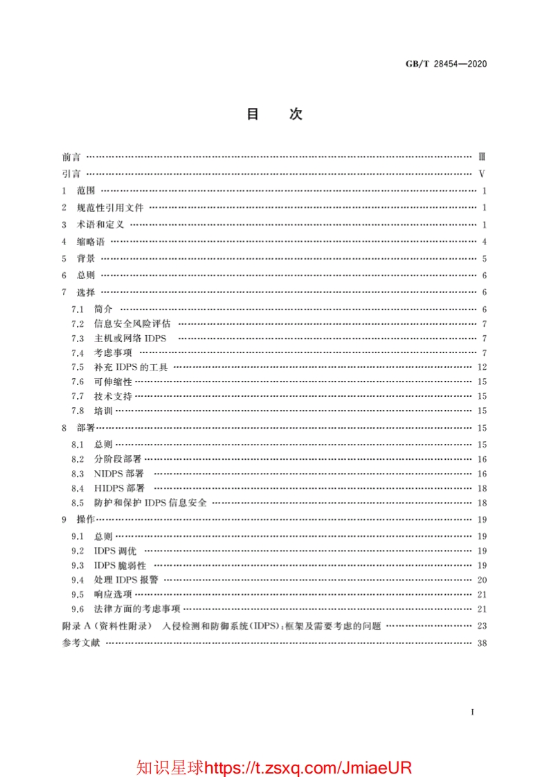 1Cs35.040L80中华人民共和国国家标准GB/T28454-2020代替GB/T28454一2012信息技术安全技术入侵检测和防御系统(IDPS)的选择、部署和操作Information technology-Security techniques-Selection,deployment andoperation of intrusion detection and prevention systems (IDPS)(ISO/IEC27039:2015,MOD)2088法202-39-09国家市场监督管理总局国家标准化管理委员会发布知识星球https:/t.Zsxq.com/JmiaeUR