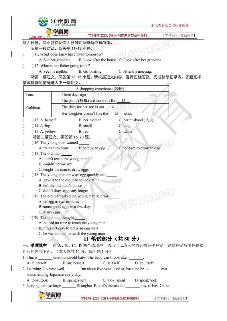 少润玉教急润禾教育初二QQ交流群学科阿370801852学科网ZK00M)-网校通名校系列资料上学科网,下精品资料!2015-2016学年第一学期初二英语期中考试试卷出卷:胡馨Q审卷:黄淑扬2015.11学(时间100分钟满分100分)I听力部分(20分)一、听对话回答问题(计10分,每小题1分)本部分共有10道小题,每小题你将听到一段短对话,每段对话听两遍。在听每段对话前,你将有5秒钟的时间阅读题目。听完后,你还有5秒钟的时间选择正确答案。在听到嘀的信号后,进入下一小题。()1.What animal does the woman dislike?A.)2.Which sign are they talking about?B)3.Which season does the woman like best?Spring网summerA.3B.)4.When did the man get up today?AB)5.What does the woman mean?0A.She is happy to lend her car to the man.网0MKC0MB.She doesn't like to lend her car to the man.C.She wants to borrow a car from the man.)6.How does the boy tell Jim about the news?A.By talking on QQ.B.By writing a letter.C.By sending an e-mail()7.Where are they talking?A.In the market.B.In the hospital.C.In the office)8.What did Nancy and Lucy think of the film?A.They both enjoyed it.B.They didn't like it.C.One of them liked it()9.How old is Susan?A.She is 12.B.She is 14.C.She is 16.)10.What is the woman doing now?A.She is staying with her parents.B.She is on her way to AustraliaC.She is meeting her parents at the station.二、听对话或短文回答问题(计10分,年小题1分)你将听到一段对话和两篇短文,各听两遍。听每段对话或短文前,你将有时间阅读相关小题,每小令学到阿学科ZXK.C0M)-网校雨名校系列资料上学科网,下精品资料!