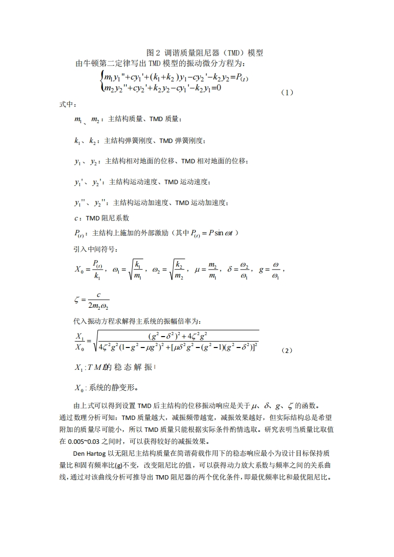 调谐质量阻尼器TD基本原理及减振效果评价胡争锋一、TMD简介调谐质量阻尼器(Tuned Mass Damper,简称TD)是附加在结构上的一个子结构。由质量块、弹簧和阻尼器组成,质量块通过弹簧和阻尼器与主结构相连接。如图1所示。其中质量单元用来产生对结构的控制力(惯性力),弹簧单元用来调谐TD的自振频率,获得最优的控制效果,此外弹簧单元也起到将TD的质量单元恢复到初始状态的作用,阻尼单元吸收从结构传到TD的能量并限制TD的运动位移。其减振原理是:当主结构发生振动时导致TD产生相对主结构的振动,TMD的相对振动产生的惯性力又反作用到结构上,从而抑制主结构的振动。连接钢板弹簧位移导向弹簧可调整质量块粘滞阻尼器图1调谐质量阻尼器二、TMD的理论模型TD是一个典型的二阶质量弹簧阻尼系统,忽略主结构的阻尼,其工作原理如图2所示。P主结构mka手中cTMDm2
