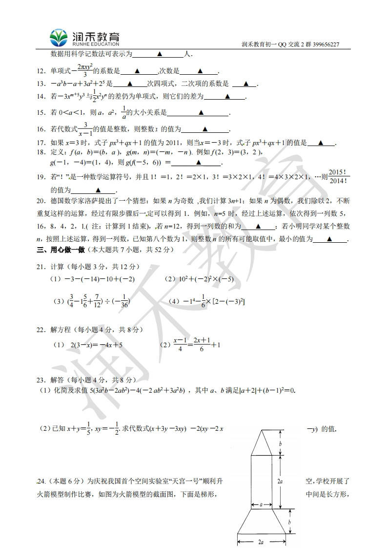 润无教育RUNHE EDUCATION润禾教育初一QQ交流2群3996562272015-2016学年度第一学期初一数学期中试卷测试时间:100分钟满分:110分一、精心选一选(本大题共8小题,每小题3分,共计24分),L.一2的相反数是…(A1A.2B.一2C.2D.-22下列各数-学,0,(一引,31415,π,-3.4中,正分数有…(A.3个B.4个C.5个D.6个3.下列各组数中,数值相等的是…(A.34和43B.-42和(-4)2C.-23和(-2)3D.(一2×3)2和-22×324.若(m一2)x网1=5是关于x的一元一次方程,则m的值为…(A.±2B.-2C.2D.45.如果a十b>0,ab<0,那么A.a>0,b>0B.a、b异号且负数的绝对值较大C.a<0,b<0D.a、b异号且负数的绝对值较小6.下列说法中正确的个数有…(▲)①0是绝对值最小的有理数:②无限小数是无理数:③数轴上原点两侧的数互为相反数:④a,0,都是单项式:⑤单项式-错误未找到引用源.2罗的系数为2,次数是3:©3344一是关于x,y的三次三项式,常数项是-1.A.2个B.3个C.4个D.5个7.数a、b在数轴上如图所示,化简|b十ad一2b-d的值为…(▲)A.3a-bB.3b-aC.a-3bD.b-3aA3a-2.-1b0第7趣图第8题图8.如图,点A、B对应的数是a、b,点A在一3,一2对应的两点(包括这两点)之间移动,点B在一1,0对应的两点(包括这两点)之间移动,则以下四个代数式的值,可能比2013大的是11A.b-aB.b-aC.(a-b)2D.ab二、请细心填一填(本大题共12小题,每空2分,共34分)9.-的绝对值是▲一,一的倒数是10.平方得16的数为▲▲的立方等于一8.11.我国第六次全国人口普查中,具有大学(指大专以上)文化程度的人口约为120000000人,将这个