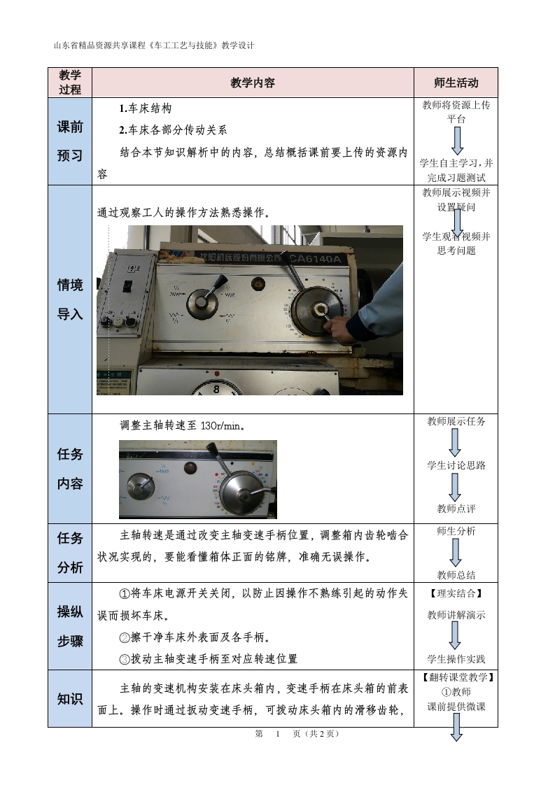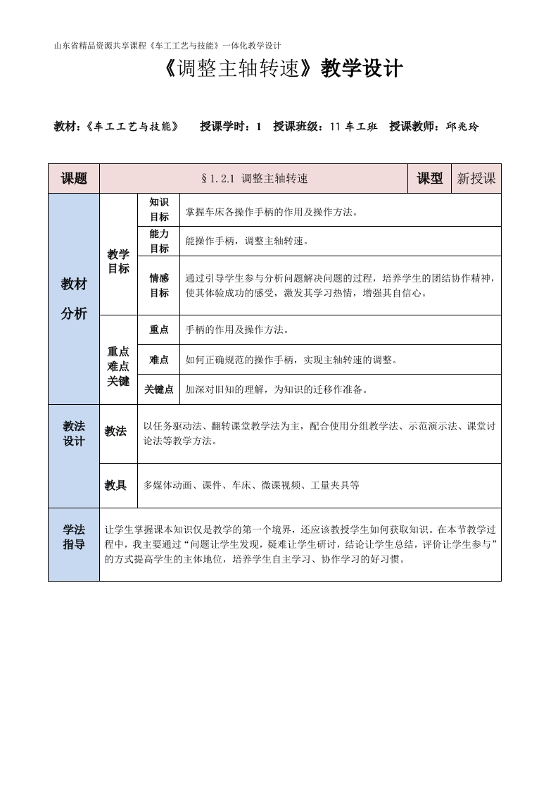 山东省精品资源共享课程《车工工艺与技能》一体化教学设计《调整主轴转速》教学设计教材:《车工工艺与技能》授课学时:1授课班级:11车工班授课教师:邱兆玲课题§1.2.1调整主轴转速课型新授课知识目标掌握车床各操作手柄的作用及操作方法。能力能操作手柄,调整主轴转速。教学目标目标教材情感通过引导学生参与分析问题解决问题的过程,培养学生的团结协作精神,目标使其体验成功的感受,激发其学习热情,增强其自信心。分析重点手柄的作用及操作方法。重点难点难点如何正确规范的操作手柄,实现主轴转速的调整。关键关键点加深对旧知的理解,为知识的迁移作准备。教法教法以任务驱动法、翻转课堂教学法为主,配合使用分组教学法、示范演示法、课堂讨设计论法等教学方法。教具多媒体动画、课件、车床、微课视频、工量夹具等学法让学生掌握课本知识仅是教学的第一个境界,还应该教授学生如何获取知识。在本节教学过指导程中,我主要通过“问题让学生发现,疑难让学生研讨,结论让学生总结,评价让学生参与”的方式提高学生的主体地位,培养学生自主学习、协作学习的好习惯。