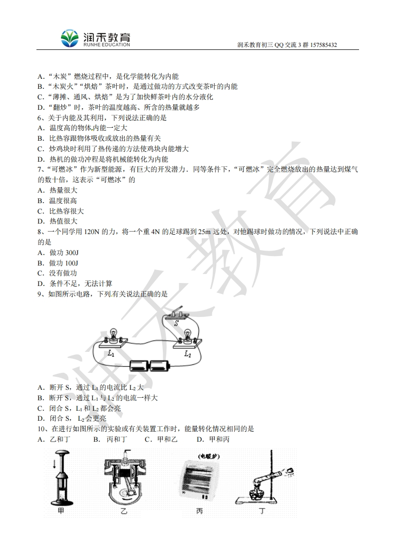 润无教育RUNHE EDUCATION润禾教育初三QQ交流3群1575854322015年南长区九年级期中物理试卷(总分100分,考试时间:90分钟)本试卷分试题和答题卡两部分,所有答案一律写在答题卡上.试卷满分为100分.注意事项:1.答卷前,考生务必用0.5毫米黑色墨水签字笔将自己的姓名、准考证号填写在答题卡的相应位置上.2.答选择题必须用B铅笔将答题卡上对应题目的正确选项涂黑.如需改动,用橡皮擦干净后再选涂,3.答主观题必须用0.5毫米黑色墨水签字笔作答,答案写在答题卡各题目指定区域内相应位置上.如需改动,先划掉原来的答案,然后再写上新的答案,不准使用铅笔和涂改液.不按以上要求作答的答案无效.4.考生必须保持答题卡的整洁.考试结束后,将试题卷和答题卡一并交回一、选释题(共14小题,每小题2分,共28分。每小题给出的四个选项中只有一个正确.)1、在如图所示的四种情境中,人对物体没有做功的是将地面上的物体向上堆积端着花盆水平匀速前进用拖把拖地技掷标枪2、根据工作需要选择合适的工具是劳动者的基本技能。要剪断铁丝等较硬的物体,下图中的4种剪刀应选择3、甲、乙两种机械的效率分别是70%和50%,则下列说法中正确的是A.使用甲机械省力B.使用甲机械做功快C.乙机械的额外功在总功中占的比例大D.在相同的时间内,使用甲机械完成的功多4、如图所示,与实物图一致的电路图是H⑧HB05、荣获中国名茶评比金奖的岳西翠兰,手工制作过程非常复杂:“采回的鲜茶叶,要及时、均匀地薄摊在洁净的竹匾上,晾在通风良好的地方要用火力均匀的木炭火在锅内手工翻炒、烘焙.等八道精细的工序”,如图所示.则下列说法中,正确的是