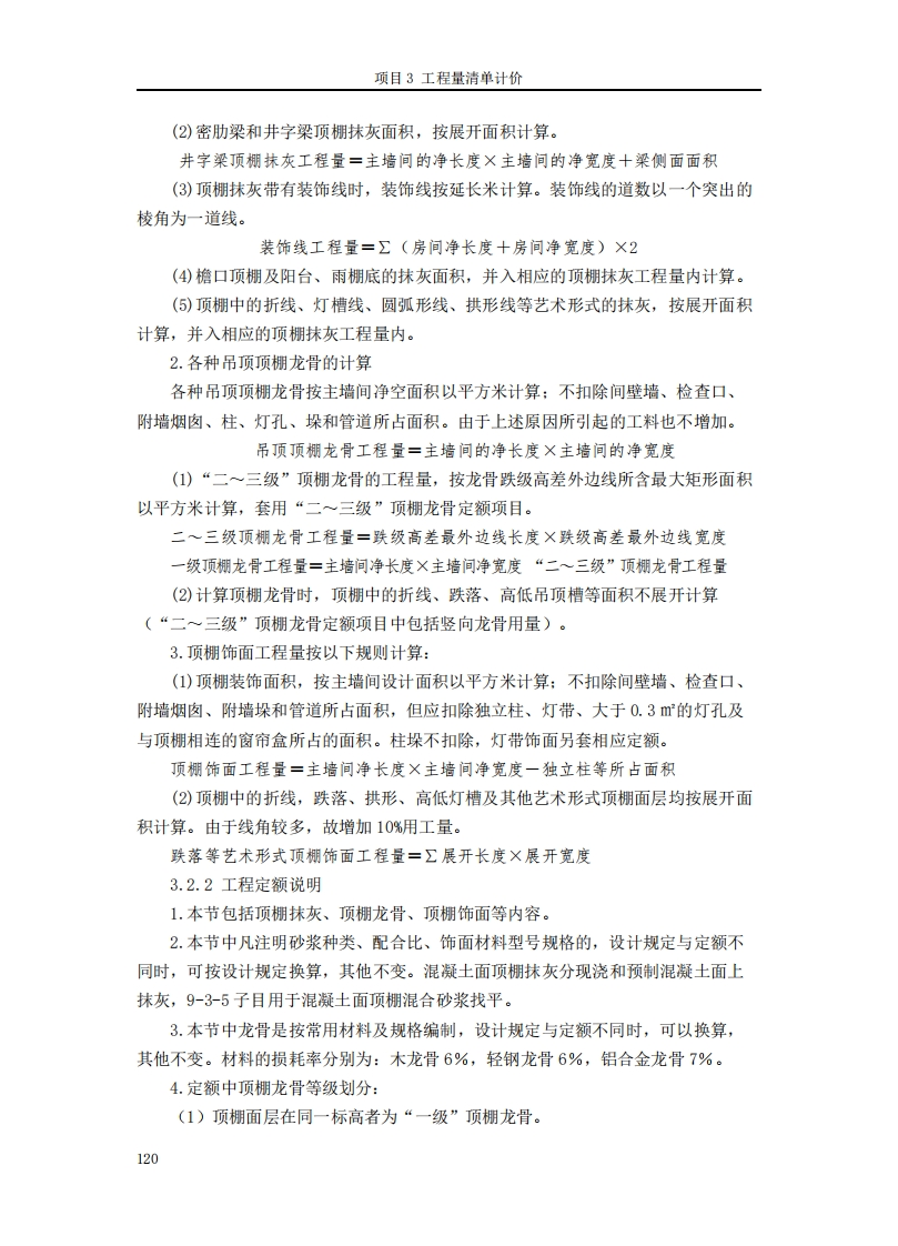 建筑工程计量与计价任务3顶棚工程计量与计价3.1任务导入3.1.1任务描述通过详细阅读分析明德楼施工图纸可知,本工程走廊顶棚为装饰石膏板吊顶。建筑做法:①T型轻钢主龙骨TB24×38中距小于等于1200,龙骨吸顶吊件用膨胀螺栓与钢筋混凝土板固定:②T型轻钢次龙骨TB24×28中距600或1200:③11-12厚装饰石膏板面层规格592×592。3.1.2任务分析通过本任务的学习,熟悉建筑装饰装修工程预算定额顶棚工程计算规则,能够计算聊城市高级工程职业学校明德楼建施4项目顶棚工程的工程量。3.1.3任务目标1.知识目标(1)掌握装饰工程顶棚工程量计算规则(2)掌握顶棚工程消耗量定额说明及定额项目表的构成(3)掌握顶棚工程量计算及定额应用2.技能目标(2)能正确掌握墙、柱、面装饰工程的工程量计算(3)能正确应用消耗量定额选套定额项目7.3.情感目标(1)激发学生学习本课的积极性:(2)培养学生自我学习、探究学习的意识:(3)培养学生具有初步的合作态度3.2知识链接3.2.1工程量计算规则1.顶棚抹灰工程量按以下规则计算(1)顶棚抹灰面积,按主墙间的净面积计算:不扣除柱、垛、间壁墙、附墙烟肉、检查口和管道所占的面积。带梁顶棚,梁两侧抹灰面积,并入顶棚抹灰工程量内计算。顶棚抹灰工程量=主墙间的净长度×主墙间的净宽度十梁侧面面积119