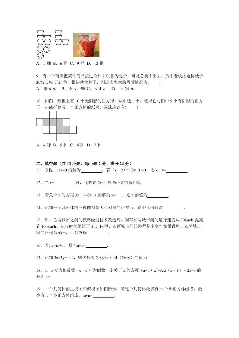 2015-2016学年江苏省无锡市钱桥中学七年级(上)月考数学试卷(12月份)一、选择题(共10小题,每小题2分,满分20分)1.下列方程中,是一元一次方程的是(A.1-12B.x2-10C.2x-y3D.x-3号2.关于x的方程2x-3=1的解为()A.-1B.1C.2D.-23.如图是一块带有圆形空洞和方形空洞的小木板,则下列物体中既可以堵住圆形空洞,又可以堵住方形空洞的是(4.圆柱可以看作由哪个图形沿它的一边快速旋转得到()A.直角三角形B.梯形C.长方形D.等腰三角形5.下列图形中,能够折叠成正方体的是(6.在某月历表中,竖列相邻的三个数的和为39,则该列第一个数是(A.6B.12C.13D.147.A种饮料比B种饮料单价少1元,小峰买了3瓶A种饮料和4瓶B种饮料,一共花了18元.如果设B种饮料单价为x元/瓶,那么下面所列方程正确的是()A.3x+4(x-1)=18B.3(x+1)+4x=18C.3x+4(x+1)=18D.3(x-1)+4x=188.若干桶方便面摆放在桌子上,实物图片左边所给的是它的三视图,则这一堆方便面共有()