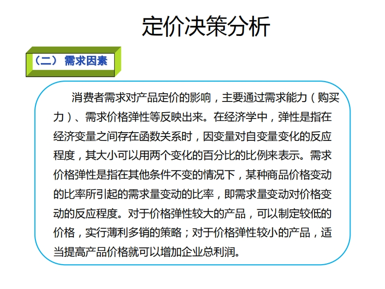 定价决策分析348072@abc3个月前发布关注私信0.75MB8页022定价决策分析此内容为付费资源,请付费后查看¥13¥19黄金会员免费钻石会员免费立即购买您当前未登录!建议登陆后购买,可保存购买订单付费资源 第1页 / 共8页 第2页 / 共8页 试读已结束,还剩6页,您可下载完整版后进行离线阅读 THE ENDPPT模板办公模板实用范文物联网设计网站设计网络规划设计 文本预览 定价决策分析影响价格的基本因素(一)成本因素从根本上来说,任何企业都必须以营利为目的。因此产品或服务定价应当以补偿成本为前提。成本是影响定价的最基本因素。从长期来看,产品价格应等于总成本加上合理的利润,否则企业无利可图,将会停止生产;从短期来看企业应根据成本结构确定产品价格,即产品价格必须高于平均变动成本,以便掌握盈亏情况,减少经营风险。 查看更多 收起部分 喜欢就支持一下吧收藏