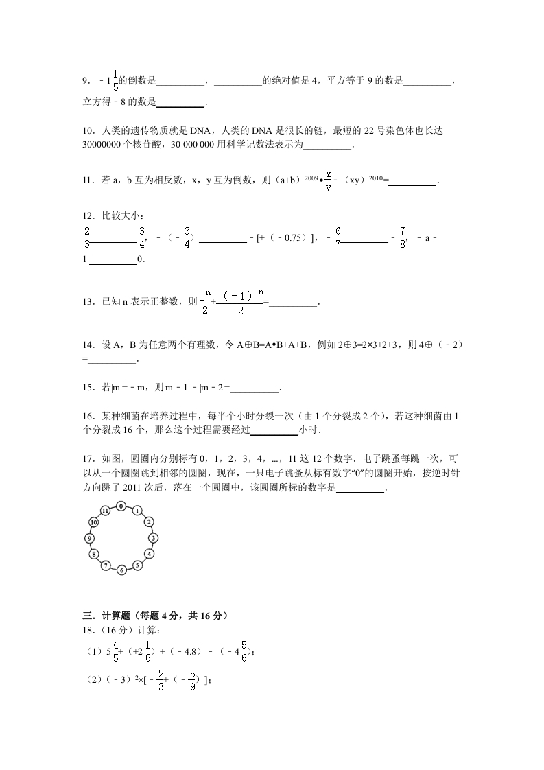 2015-2016学年江苏省无锡市太湖格致中学七年级(上)月考数学试卷(10月份)一.选择题(每题3分,共24分)1.下面说法正确的有()(1)正整数和负整数统称整数:(2)0既不是正数,又不是负数:(3)绝对值最小的有理数是0:(4)正数和负数统称有理数.A.4个B.3个C.2个D.1个2.在数壹1-2[(05)小·(-1》,(-1D4中负数的个数是()A.4个B.3个C.2个D.1个3.离太阳最远的冥王星和海王星是非常赛冷的世界.冥王星的背阴面温度低至-253℃,向阳面也只有-223℃.冥王星背阴面的温度比向阳面的温度低()A.-30℃B.30℃C.-476℃D.476℃4.绝对值大于2而小于5的所有正整数之和为()A.7B.8C.9D.105.如图,数轴上的A,B两点分别表示有理数a,b,则在下列各式中,不成立的是()AA.ab C.a-b6.己知k=3,y=2,且xy>0,则x+y的值是()A.5或-5B.-1或1C.5或1D.-5或-17.如果x是有理数,那么()A.1-x的值一定比1小B.1-x2的值一定比1小C.1-x的值一定不大于1D.1-x2的值不大于18.巴黎与北京的时差为-7小时(正数表示同一时刻比北京早的时数),如果北京时间是10月2日14时,那么巴黎时间是()A.10月2日21时B.10月2日7时C.10月2日5时D.10月1日7时二.填空题(每空2分,共30分)