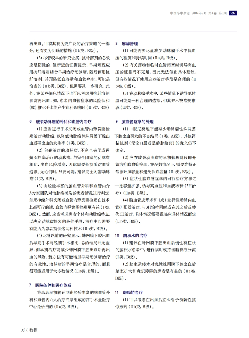 598 Chin J Stroke,July 2009,Vol 4,No.7·指南与规范·动脉瘤性蛛网膜下腔出血处理指南■贾莉,吕琳,夏敏作者单位[编者按】美国心脏病学会/美国卒中学会于2009年发布了动脉瘤性蛛网膜下腔出血处理指南,本'22013山东省济宁市文编译了指南中的建议那分。济宁医学院临床学院【关键词】蛛网膜下腔出血;动脉瘤;美国;指南诊断学教研室2济宁医学院附属医院1蛛网膜下腔出血的预防脑积水、早期血管造影术以及脑室引流的存在神经内科通信作者(1)高血压与动脉瘤性蛛网膜下腔出血(Ib类,B级)。贸莉xiaoyu800622@163.之间的关系尚不确定。然而,建议使用降压药com物治疗高血压以预防缺血性卒中、脑出血和心、3动脉瘤性蛛网膜下腔出血的临床表现和诊肾等终末器官损害(I类,A级)。断(2)尽管吸烟与蛛网膜下腔出血相关性的(1)蛛网膜下腔出血是一种急症,经常被误证据是间接的,戒烟仍是减少蛛网膜下腔出血诊。患者有急性发病的严重头痛时,要高度怀风险的合理性建议(Ia类,B级)。疑蛛网膜下腔出血(I类,B级)。(3)在某些高危人群中筛查未破裂动脉瘤(2)怀疑蛛网膜下腔出血时,应当进行CT的意义尚不确定(Ib类,B级):先进的无创性扫描(I类,B级),如果CT扫描结果阴性,强成像技术可用于动脉瘤筛查,但导管血管造影烈建议行腰穿脑脊液检查(1类,B级)。仍是临床明确有无动脉瘤的诊断金标准。(3)在有蛛网膜下腔出血的患者中,应当进行选择性脑血管造影,以明确动脉瘤的存在和2动脉瘤性蛛网膜下腔出血的自然史和结局解剖学特点(I类,B级)。(1)要迅速明确最初出血的严重程度,因为(4)当传统的血管造影不能及时进行时,可这是动脉瘤性蛛网膜下腔出血后最有用的预后以考虑磁共振成像和CT造影(Ⅱb类,B级)。判断指标,严格依照这一因素制定的分级量表有助于医生与家属一起讨论未来的治疗计划(14急诊评估和手术前治疗类证据,B级)。(1)蛛网膜下腔出血分级系统确定神经缺(2)病例回顾性分析和前瞻性队列研究已损的程度,有助于判断预后和分诊(Ⅱa类,B经显示,未处理的破裂动脉瘤中,最初24h内级)。至少有3%~4%的再出血风险。这一风险还有可(2)用于评估有头痛及其他潜在蛛网膜下能更高。初次发病后早期发生再出血的比例很腔出血症状患者的标准化急诊管理规程尚未高(2~l2h内),再出血风险在第1个月是每日出现,应该进行制定(Ia类,C级)。1%2%,3个月后的长期风险是每年3%。因此在怀疑蛛网膜下腔出血时,建议给予紧急评估5蛛网膜下腔出血后预防再出血的内科措施和治疗(I类,B级)。(1)应当管理和控制血压以平衡卒中风险(3)将患者分诊去做动脉瘤修复时,在确定高血压相关的再出血风险和维持脑灌注压(I再出血风险时,要考虑以下因素:最初出血的严类,B级)。重程度、人院时间、血压、性别、动脉瘤的特点、(2)单纯卧床不能预防蛛网膜下腔出血后万方数据