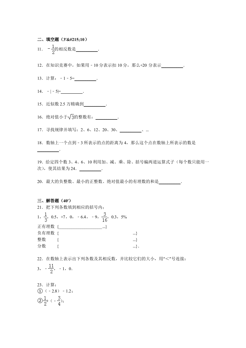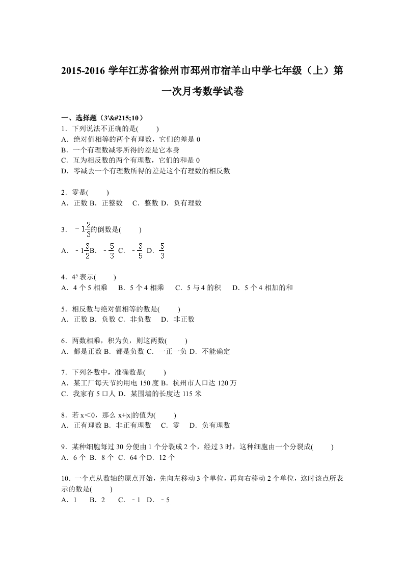 2015-2016学年江苏省徐州市邳州市宿羊山中学七年级(上)第一次月考数学试卷一、选择题(3×:10)1.下列说法不正确的是()A.绝对值相等的两个有理数,它们的差是0B.一个有理数减零所得的差是它本身C.互为相反数的两个有理数,它们的和是0D.零减去一个有理数所得的差是这个有理数的相反数2.零是(A.正数B.正整数C.整数D.负有理数3.1的倒数是()A.-13B.-5.-3D.554.45表示(A.4个5相乘B.5个4相乘C.5与4的积D.5个4相加的和5.相反数与绝对值相等的数是()A.正数B.负数C.非负数D.非正数6.两数相乘,积为负,则这两数()A.都是正数B.都是负数C.一正一负D.不能确定7.下列各数中,准确数是()A.某工厂每天节约用电150度B.杭州市人口达120万C.我家有5口人D.某围墙的长度达115米8.若x<0,那么x+x的值为()A.正有理数B.非正有理数C.零D.负有理数9.某种细胞每过30分便由1个分裂成2个,经过3时,这种细胞由一个分裂成()A.6个B.8个C.64个D.12个10.一个点从数轴的原点开始,先向左移动3个单位,再向右移动2个单位,这时该点所表示的数是()A.1B.2C.-1D.-5