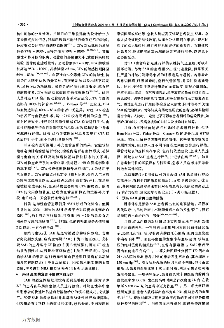 中回脑血管病杂志2009年6月18H第6卷第6期Chin】Cerebrovasc Dis,Jun18,2009,Vol6,No.6331·规范与指南·动脉瘤性蛛网膜下腔出血的治疗指南(ASA2009年版)(中)美国心脏协会卒中专家委员会关键词:蛛网膜下腔出血;治疗,临床研究性;指南doi:10.3969/j,issn.1672-5921.2009.06.014中图分类号:R743.35文献标识码:C5aSAH的临床表现和诊断93%如0:而在出血后6d,检出率仅有57%一85%【%,1SAH的临床表现非常典型。约8O%提供病史的患者描鉴于无法确保CT的检出率达到100%,故在CT结果阴性述症状为“有生以来最剧烈的头痛”,另20%的忠者则有先时,需对患者行诊断性腰惟穿刺。穿刺技术无误,合理检测兆性的头痛发作」。而大多数颅内动脉瘤忠者在动脉痛样本与正确分析脑脊液成分,对确诊至关重要。检查的关键破裂前无症状出现。SAH在任何时候均可发生,重体力劳动点在于:脑脊液中红、白细胞比例,是否黄染,是否有胆红素或运动等因素也可诱发SAH。其症状除头痛外,还可以及腰椎穿刺时间等侧防,2。通过检查脑脊液以诊斯能伴有恶心,呕叶,颈项强直,短暂的意识丧失或局灶性神经SAH的相指南已经发表2。在出现突然剧烈头痛、经CT功能障碍(包括脑神经麻痹)等。Fontanarosa1对109例确和脑脊液检查排除先兆性出血的忠者一般预后良好222)。诊的SAH忠者进彳行了可顾性研究,发现其中74%的忠者有我们建议,对于上述检香阴性的患者仍需要重复检查、处理头痛症状,77%有恶心或者呕叶.53%出现意识丧失及35%头痛症状并进行门诊随访)。伴有颈项强直。其中12%的忠者在接受治疗前死亡。MRI也可用于诊断SAH。质子密度加权成像和液体衰除典型的临床表现外,SAH还有一些其他症状。而且由于减反转恢复序列等技术的应用,使MRI对SAH急性期的检不同患者的头痛表现各不相同,故经常会出现误诊或诊断延迟。出率显著提高4,2421,但仍有许多局限性,如MRI的即时1985年以前,SAH的误诊率曾达64%,近期下降至12%左性,对运动伪差的敏感性、患者的顺应性以及检查所需时间右21,m。在几乎没有神经系统症状或症状轻微的患者中,长H花费较高等。总之,上述因素制约了MRI成为SAH急被误诊患者的1年死亡率和致残率高于其他忠者4倍。最常性期的常规检查项甘。但MRI仍能获得患者脑部的更多信见的误诊原因是患者卡接受头部CT打描.4%。息,并寻找可能发SAH的其他原因。MRI和MRA检查较患者陈述病史时可能会显示,在大出血发生前曾有少址适于头部CT或血管造影阴性、同时腰椎穿刺结果不明确的出血,被称为“先兆性出血”m。大多数先兆性出血引发的忠者。头猫不别烈,们会持续数天,大部分发生在大出血前的2~8在过去10年对SAH的诊断中,MRA的使用也在明显增周内?。恶心和呕吐也可能出现,何不伴有脑膜刺激加,但在确定动脉宿的性质和位置方面仍无法取代脑血管造征。共涉及1752例患者的3项研究显示,340例(15%~影。不仅由于MRI检查的局限性同样存在于MRA中,其他37%,平均为20%)在严重症状出现前有突发头痛因素,如动脉瘤的大小,成像序列及图像处理方式等,均会影史7.7」。当然,我们也不能过分强调“先兆性出血”的重响结果。三维体积扫描时间飞跃法(3-dimensional time-of-要性。在因头痛而急诊的全部患者中,SAH患者仅占1ight)MRA成像对于动脉瘤的敏感性为55%-93%[29m),1%。们若能在灾难性SAH发生前止确诊断先兆性出与动脉瘤的大小高度相关。当动脉瘤≥5mm时,MRA的敏血,这对挽教患者的生命其有重要意义。20%以上的感性高达85%~100%:而当动脉瘤<5mm时,其敏感性则SAH患者伴有癫痛,通常发生在出血后24h内a0),而且多降至56%292-)。MRA对检查动脉猫瘤颈及其与血管发生在合并脑出血、高血压以及大脑中动脉瘤和前交通动脉的关系,也存在局限性。但鉴于该检查不使用对比剂和放射瘤等疾病的患者中2。线,故适用于孕妇检查。MRA也可作为无SAH患者的筛查SAH的基本诊断方法是头部CT平扫0,其检出率与手段6)。患者的临床分级距出血的时间有关。在SAH后的12h内,CTA检查比血管造彩更为快捷,创伤较小,同时已被证CT的检出率高达98%~100%:至24h后降低至实对较大动脉骝的敏感性接近于血管造影。CTA的技术操作是静脉快速注射对比剂,并对日标区域进行动脉成像,检译者单位:100053北京,首都医科大学临床医学系七年制2003查是否成功,取决于能否在该区域的对比剂至最大量时,进级(何福亮):首都医科大学宣武医院神经外科(张鸿祺)行成像。CTA的图像包括从枕骨大孔下至W山s环上及大万方数据