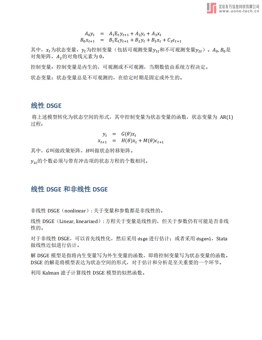 北京友万信息科技有限公司www.uone-tech.cn动态随机一般均衡分析(Dynamic Stochastic GeneralEquilibrium Model)王群勇(南开大学数量经济研究所,QunyongWang(@outlook.com)内容DSGE模型DSGE模型的贝叶斯估计DSGEDSGE是一种多元时间序列分析方法,用于宏观经济政策分析和预测。在经济运行系统中,家庭、厂商、央行、政府各自决策。家庭最大化效用,决定消费、投资和劳动力的供给。企业最大化利润,在已有技术水平下利用资本和劳动力决定产量。均衡模型的基本构成:价格系统(工资、利率和价格)、商品和要素(产量、消费、投资、劳动力、资本)和均衡条件(供给=需求)。当代宏观经济学的两大流派:实际经济周期理论(RBC)、新凯恩斯理论(NK)。RBC理论认为经济扩张和衰退都是经济对技术状态的自然而有效的响应,不需要财政或货币政策来改变宏观经济条件。新凯恩斯理论则认为经济波动源于市场失灵,宏观政策有必要干预市场运行。线性DSGE在DSGE中,个体行为由非线性动态系统方程来描述,决策规则由动态随机优化方法来解决。DSGE模型假定理性预期,即个体对未来数值的期望是正确的。DSGE模型包含三类变量:控制变量(control),状态变量(state),冲击(shock)。DSGE包含两类方程:控制方程描述控制变量与状态变量的关系,状态方程描述状态变量的动态变化方程。