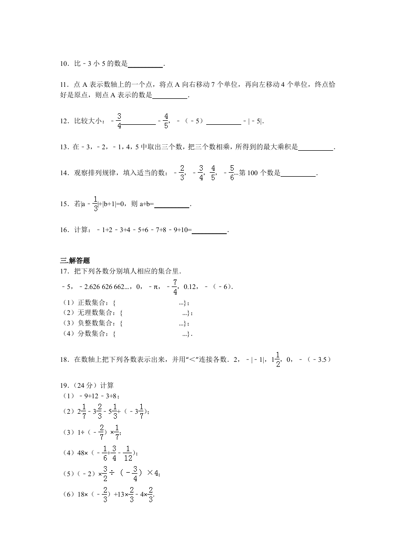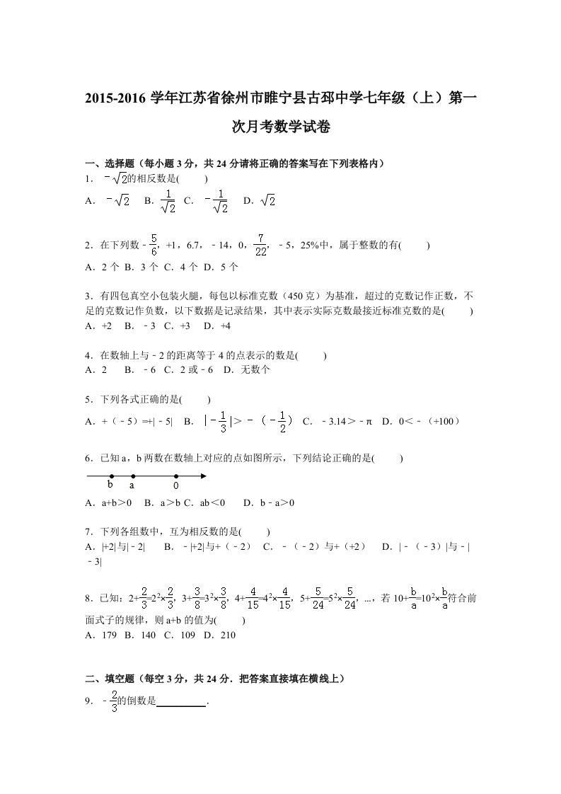 2015-2016学年江苏省徐州市睢宁县古邳中学七年级(上)第一次月考数学试卷一、选择题(每小题3分,共24分请将正确的答案写在下列表格内)1.-√2的相反数是()A反B方c方D.22在下列数吾1,61、14,07,-5,25%中,属于整数的有()A.2个B.3个C.4个D.5个3.有四包真空小包装火腿,每包以标准克数(450克)为基准,超过的克数记作正数,不足的克数记作负数,以下数据是记录结果,其中表示实际克数最接近标准克数的是()A.+2B.-3C.+3D.+44.在数轴上与-2的距离等于4的点表示的数是()A.2B.-6C.2或-6D.无数个5.下列各式正确的是(A.+(-5)=-1B.1号>-(-》)C.314>D.0<-(40)6.己知a,b两数在数轴上对应的点如图所示,下列结论正确的是()0A.a+b>0 B.a>b C.ab<0 D.b-a>07.下列各组数中,互为相反数的是()A.+2与-2到B.-+2与+(-2)C.-(-2)与+(+2)D.|-(-3)1与-1-3引8已知2号2号3合骨4是是585京若10片10时合前a面式子的规律,则a+b的值为()A.179B.140C.109D.210二、填空题(每空3分,共24分.把答案直接填在横线上)9~子的倒数思