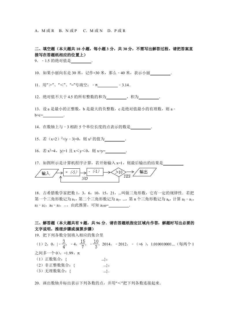 2015-2016学年江苏省盐城市射阳实验中学七年级(上)月考数学试卷(10月份)一、选择题(本大题共8小题,每小题3分,共24分,每小题所给的选项中只有一项符合题目要求,请把答案直接写在答题纸相应的位置上)1.-2的相反数是(A是B2CD22.将(+5)-(+2)-(-3)+(-9)写成省略加号的和的形式,正确的是()A.-5-2+3-9B.5-2-3-9C.5-2+3-9D.(+5)(+2)(-3)(-9)3.据有关资料显示,2014年末,盐城全市户籍人口828.5万人,将828.5万用科学记数法可表示为()A.8.285×103B.828.5×104C.8.285×105D.8.285×104.下列说法正确的是()A.同号两数相乘,取原来的符号B.两个数相乘,积大于任何一个乘数C.一个数与0相乘仍得这个数D.一个数与-1相乘,积为该数的相反数5.己知a,b两数在数轴上对应的点如图所示,下列结论正确的是()b a0→A.a+b>0 B.a>bC.ab<0 D.b-a>06.小虎微了以下4道计算愿:①0-(-1D:@号÷(-)=-1:目-号+号-合④(-1)2015=-2015,请你帮他检查一下,他一共做对了()A.1题B.2题C.3题D.4题7.己知a为不等于2,b为不等于-1的有理数,则-a-2+b+1L的值不可能是()a-2b+1A.2B.-2C.1D.08.如图,M,N,P,R分别是数轴上四个整数所对应的点,其中有一点是原点,并且MN=NP=PR=1.数a对应的点在M与N之间,数b对应的点在P与R之间,若a+b=3,则原点是()>x