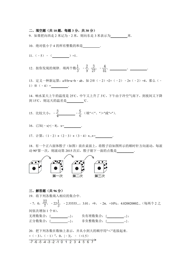 2015-2016学年江苏省扬州市高邮市澄阳初级中学七年级(上)第一次月考数学试卷一、选择题(共8题,每题3分,共24分)1.-3的绝对值是()A,3B.-专C.3D.32.响水县实验初中的校园面积约是102000平方米,用科学记数法表示为()A.102×103B.10.2×104C.1.02×105D.0.102×1053.下列说法不正确的是()A.0既不是正数,也不是负数B.1是绝对值最小的正数C.一个有理数不是整数就是分数D.0的绝对值是04.下列各式正确的是()A.-|-33B.+(-3)=3C.-(-3)=3D.-(-3)=-35.某月的月历,竖着取连续的三个数字,它们的和可能是()A.18B.33C.38D.756.若k-3什(y+3)20,则yx气)A.-9B.9C.-27D.277.若规定“1“是一种数学运算符号,且11=1,2!=2×1=2,3!=3×2×1-6,41=4×3×2×1-=24,,9g的值为100)50a0B.991C.9900D.218.古希腊著名的毕达哥拉斯派把1、3、6、10这样的数称为“三角形数”,而把1、4、9、16这样的数称为“正方形数”.从图中可以发现,任何一个大于1的“正方形数“都可以看作两个相邻“三角形数”之和,下列等式中,符合这一规律的是()●●●/●●/●●●/●●/●●●●●●●4=1+39=-3+616=6+10A.36=15+21B.49=18+31C.25=9+16D.13=3+10