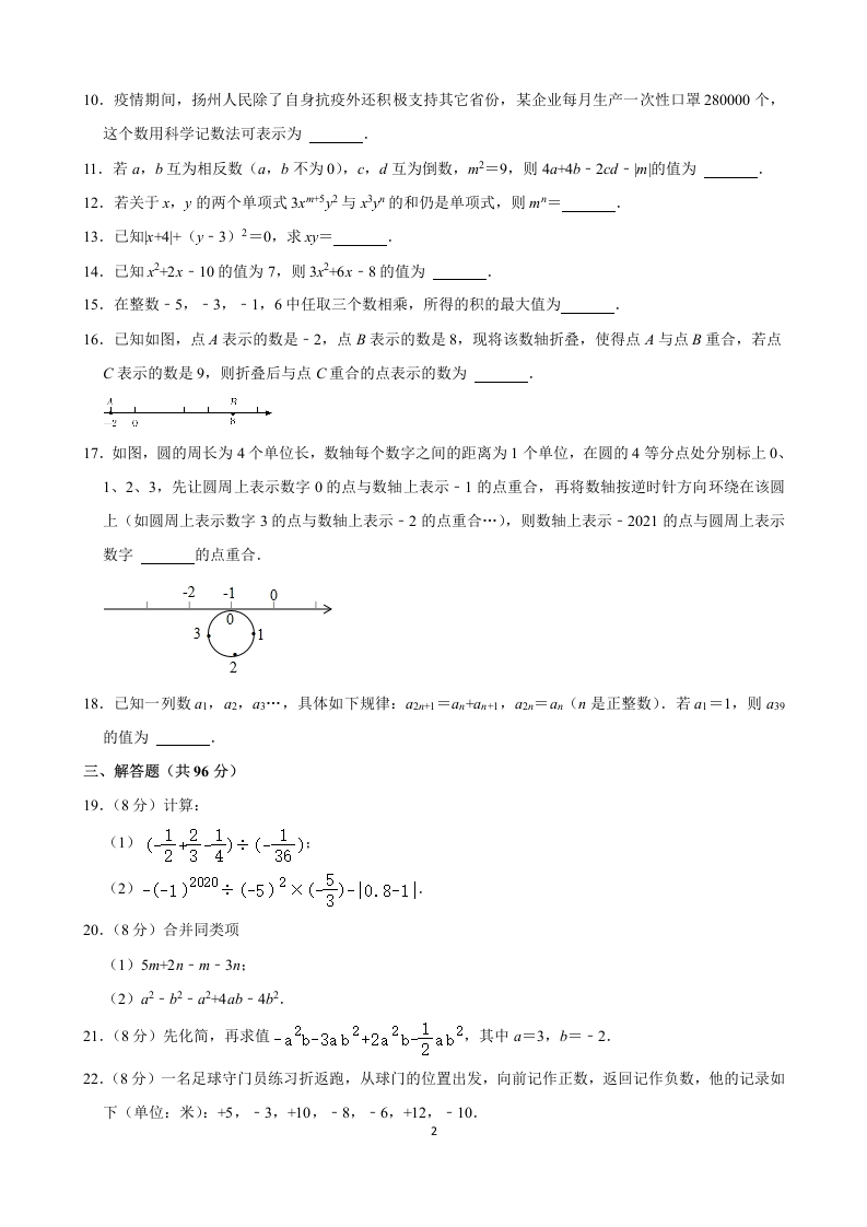江苏省扬州市邗江实验学校2021-2022学年七年级上学期期中数学试题一、精心选一选(本题共8小题,每小题3分,共24分)1.-上的倒数是(A.2C.-2D.22.单项式-3xy的系数和次数分别是()A.-3和3B.-3和4C.-6和1D.-3和93.下列代数式x+,2,x’元,m2+3m,a-b4,-8,其中整式有()A.1个B.2个C.3个D.4个4.下面合并同类项正确的是()A.2a+3b=5abB.2y-3x=-yC.5n3-m3=4D.-7a2b+2a2b=-9a2b5.小明在日历的同一列上圈出3个数,这3个数的和不可能是()A.27B.45C.60D.756.当x=-3时,多项式ax+bx3+x-5的值是7,那么当x=3时,它的值是()A.-3B.-7C.7D.-177.有理数a,b在数轴上对应点的位置如图所示,下列各式正确的是()-101→A.a+b<0B.a-b<0C.a·b>0D.a>08.把连续奇数按如下规律排列:(1)(3,5,7)(9,11,13,15,17)(19,21,23,25,27,29,31)发现奇数7在第2组第3个,奇数13在第3组第3个,奇数29在第4组第6个,则奇数2021在()A.33组第49个B.33组第50个C.33组第51个D.32组第50个二、填空题(本题共10小题,每小题3分,共30分)9.在数轴上,若点A表示-2,则到点A距离等于2的点所表示的数为1
