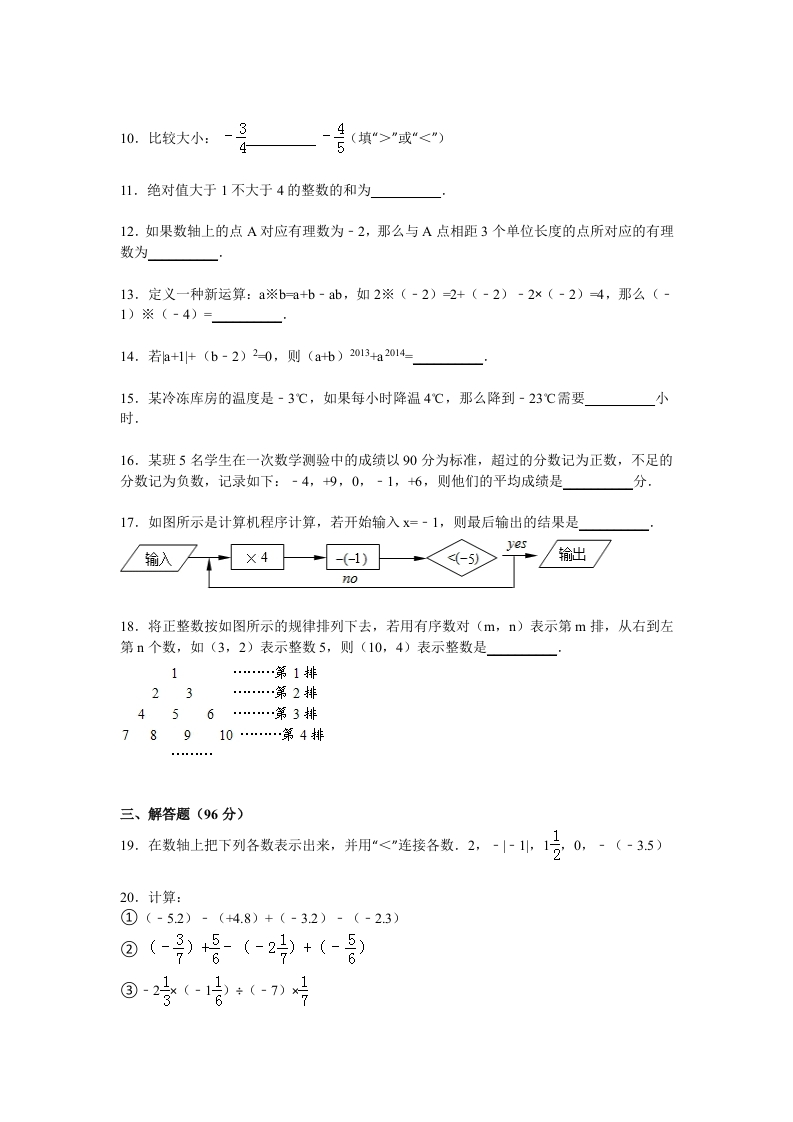 2015-2016学年江苏省扬州市江都二中七年级(上)第一次月考数学试卷一、选择题(每小题3分,共24分)1.平方等于16的数是()A.4B.-4C.±4D.(4)22.有四包真空小包装火腿,每包以标准克数(450克)为基准,超过的克数记作正数,不足的克数记作负数,以下数据是记录结果,其中表示实际克数最接近标准克数的是()A.+2B.-3C.+3D.+43.下列运算正确的是()A.-24=16B.-(-2)2-4C.(-马2-1D.(-2)38314.讲究卫生要勤洗手,人的一只手上大约有28000万个看不见的细菌,用科学记数法表示两只手上约有()个细菌.A.2.8×104B.5.6×104C.2.8×108D.5.6×1085.在有理数中,一个数的立方等于这个数本身,这种数的个数为()A.1B.2C.3D.无数个6.计算(-0.25)2007×(-4)2008等于()A.-1B.1C.-4D.47.设a为最小的正整数,b是最大的负整数,c是绝对值最小的数,d是倒数等于自身的有理数,则a-b+c-d的值为()A.1B.3C.1或3D.2或-18.古希腊著名的毕达哥拉斯派把1、3、6、10这样的数称为“三角形数”,而把1、4、9、16这样的数称为“正方形数”.从图中可以发现,任何一个大于1的“正方形数”都可以看作两个相邻“三角形数”之和,下列等式中,符合这一规律的是()。●◆●●●●●●●●。●●●4-1+39=3+616=6+10A.36=15+21B.49=18+31C.25-9+16D.13=3+10二、填空题(本大题共10个小题,每小题3分,共30分.)9.-|-2的相反数是