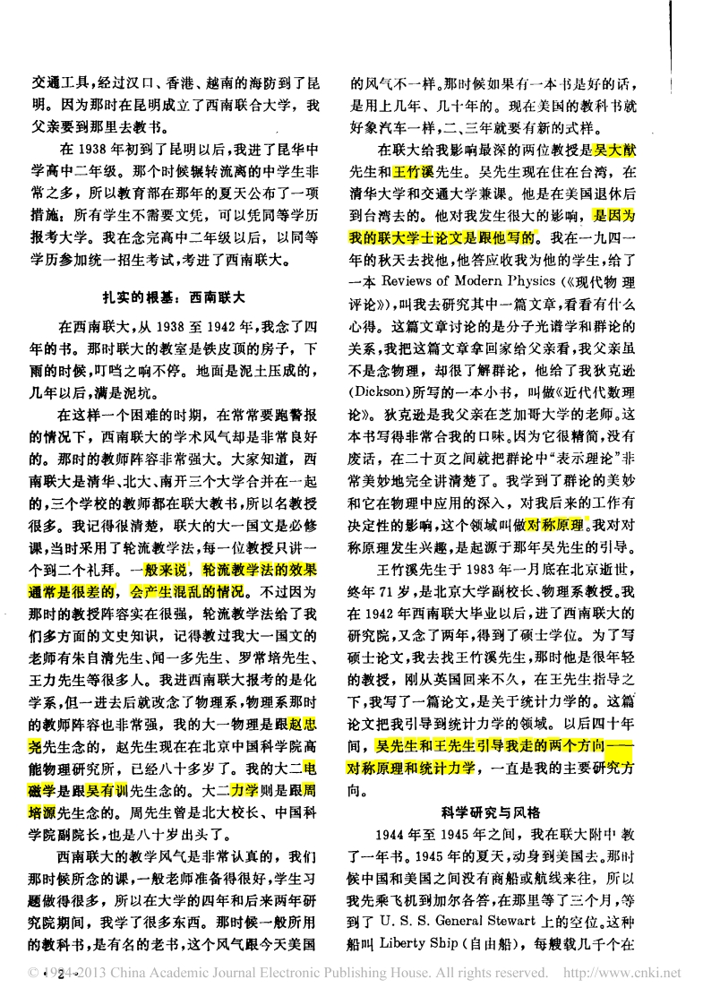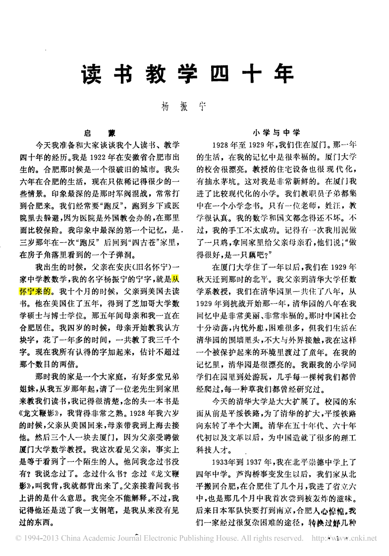读书教学四十年杨振宁启蒙小学与中学今天我准备和大家谈谈我个人读书、教学1928年至1929年,我们住在厦门。那…年四十年的经历。我是1922年在安徽省合肥市出的生活,在我的记忆中是很幸福的。厦门大学生的。合肥那时候是一个很破旧的城市。我头的校舍很漂亮。教授的住宅设备也很现代化,六年在合肥的生活,现在只依稀记得很少的一有抽水茅坑。这对我是非常新鲜的。在度门我些情景。印象最深的是那时军阀混战,常常打进了比较现代化的小学。我们教职员子弟都集到合肥来。我们经常要“跑反”,跑到乡下或医中在一个小学念书。只有一位老师,姓江,教院里去躲避,因为医院是外国教会办的,在那里学很认真。我的数学和国文都念得还不坏。不面比较保险。我印象中最深的第一个记忆,是,过,我的手工不太成功。记得行一次我用泥做三岁那年在一次“跑反”后回到“四古苍”家里,了一只鸡,拿回家里给父亲母亲看,他们说:“做在房子角落里看到的一个子弹洞。得很好,是一只藕吧?”我出生的时候,父亲在安庆(旧名怀宁)一在厦门大学住了一年以后,我们在1929年家中学教数学,我的名字杨振宁的宁字,就是从秋天迁到那时的北平。我父亲到清华大学任数怀宁来的。我十个月的时候,父亲到美国去读学系教授,我们在清华园里一共住了八年,从书。他在美国住了五年,得到了芝加哥大学数1929年到抗战开始那-一年,清华四的八年在我学硕士与博士学位。那五年间母亲和我一直在回忆中是非常美丽、非常幸福的。那时中国社会合肥居住。我四岁的时候,母亲开始教我认方十分动荡,内忧外患,困难很多,但我们生活在块字,花了一年多的时间,一一共教了我三千个清华园的围墙里头,不大与外界接触,我在这样字。现在我所有认得的字加起来,估计不超过·一个被保护起来的环境里渡过了童年。在我的那个数目的两倍。记忆里,清华园是很漂亮的。我跟我的小学同那时我的家是一个大家庭,有好多堂兄弟学们在园里到处游玩,几乎每一棵树我们都曾姐妹,从我五岁那年起,请了一位老先生到家里经爬过,每一种草我们都曾经研究过。来教我们读书,我记得很清楚,念的头一本书是今天的清华大学是大大扩展了。校园的东《龙文鞭影》,我背得非常之熟。1928年我六岁面从前是平绥铁路,为了清华的扩大,平绥铁路的时候,父亲从美国回来,母亲带我到上海去接向东转了半个大圈。清华在五十年代、六十年他。然后三个人一块去厦门,因为父亲受聘做代初以及文革以后,为中国造就了很多的理工厦门大学数学教授。我这次看见父亲,事实上科技人才。是等于看到了一个陌生的人。他问我念过书没1933年到1937年,我在北平崇德中学上了有?我说念过了。念过什么书?念过《龙文鞭四年中学。芦沟桥事变发生以后,我们家从北影》,叫我背,我就都背出来了。父亲接着问我书平搬回合肥,在合肥住了几个月,我进了省立六上讲的是什么意思。我完全不能解释。不过,我中,也是那几个月中我首次尝到被轰炸的滋味。记得他还是送了我一支钢笔,是我从来没有见后来日本军队快要打到南京,合肥人心惶惶.我过的东西。们一家经过很复杂困难的途径,转换过静几种1994-2013 China Academic Journal Electronic Publishing House.All rights reserved.http:wiww.cnki.net