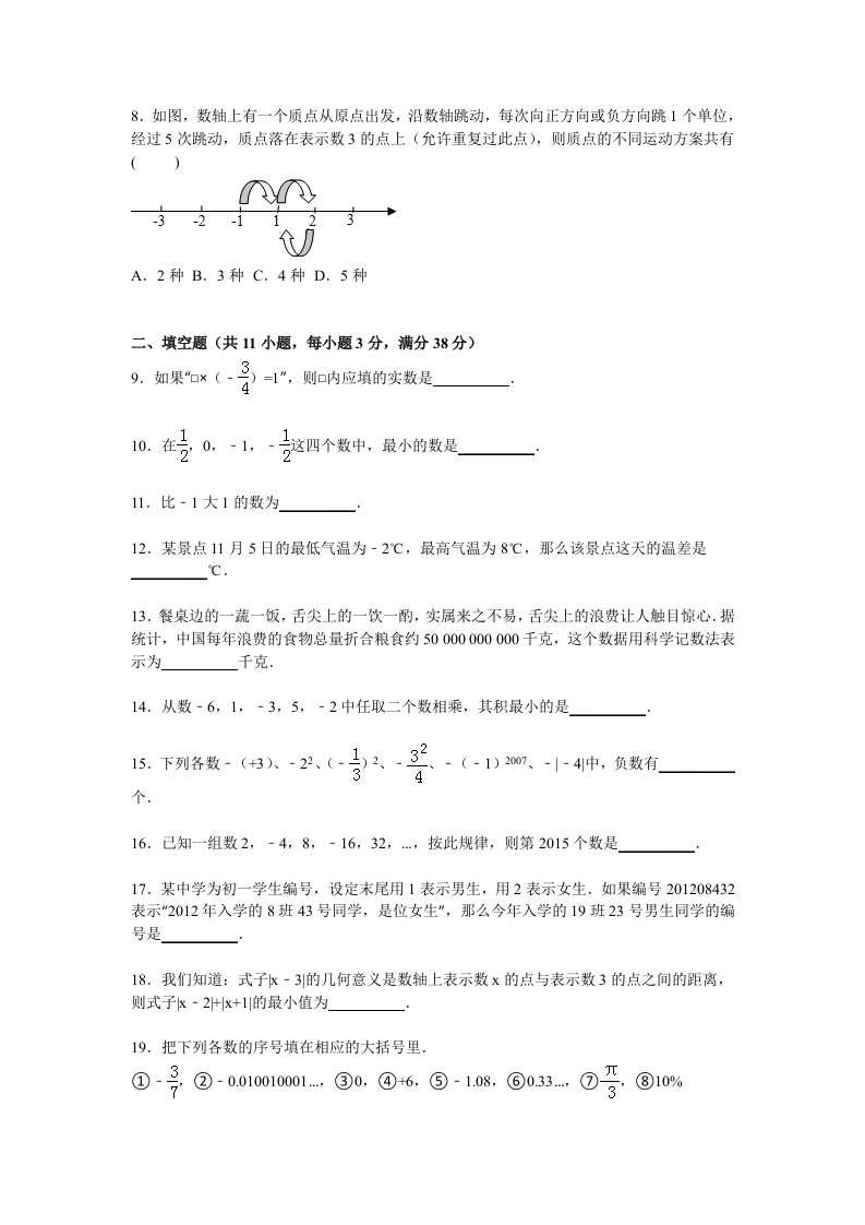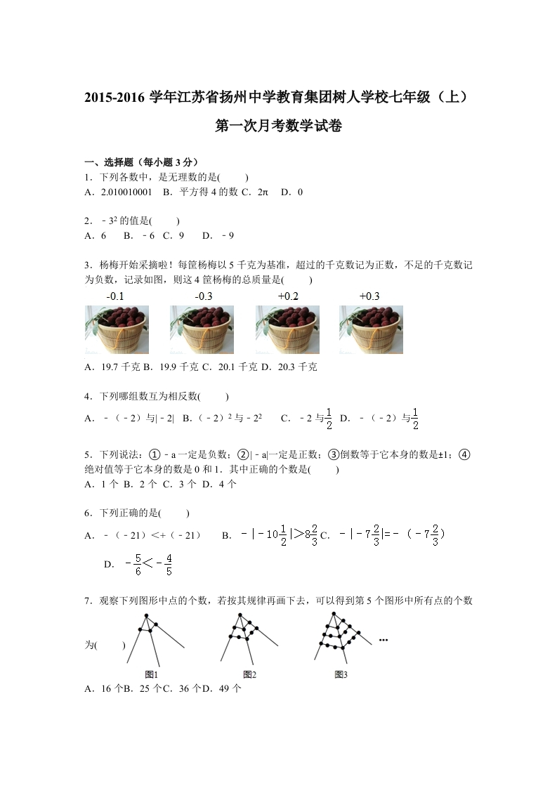 2015-2016学年江苏省扬州中学教育集团树人学校七年级(上)第一次月考数学试卷一、选择题(每小题3分)1.下列各数中,是无理数的是()A.2.010010001B.平方得4的数C.2nD.02.-32的值是(A.6B.-6C.9D.-93.杨梅开始采摘啦!每筐杨梅以5千克为基准,超过的千克数记为正数,不足的千克数记为负数,记录如图,则这4筐杨梅的总质量是(-0.1-0.3+0.2+0.3A.19.7千克B.19.9千克C.20.1千克D.203千克4.下列哪组数互为相反数()A.-(-2)与-2B.(-2)2与-22c2号2)月5.下列说法:①-a一定是负数:②1-副一定是正数:③倒数等于它本身的数是±l:④绝对值等于它本身的数是0和1.其中正确的个数是(A.1个B.2个C.3个D.4个6.下列正确的是()A.-(-21)<+(-21)B-1-10哈>号c.--7=-(-7)7.观察下列图形中点的个数,若按其规律再画下去,可以得到第5个图形中所有点的个数为(图1A.16个B.25个C.36个D.49个