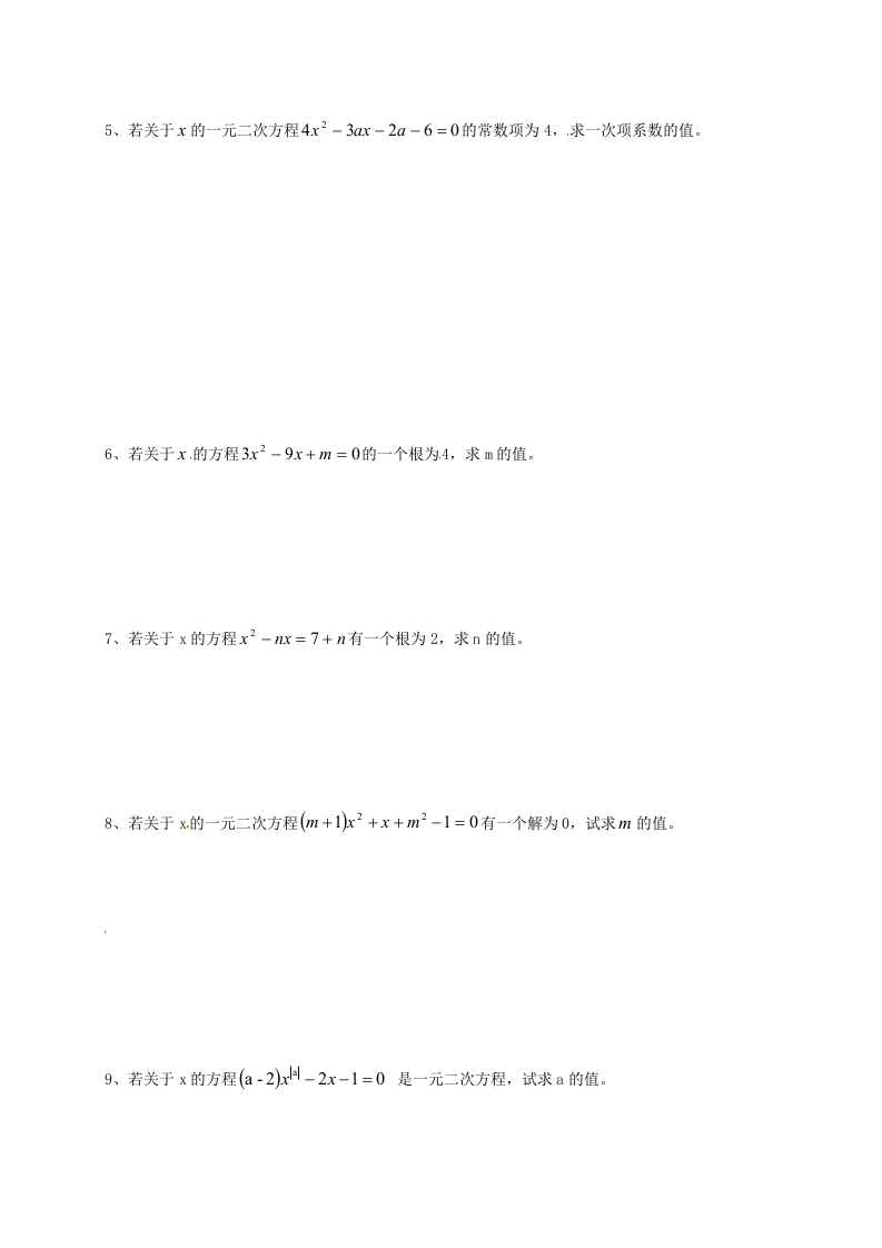 1.1一元二次方程基础习题一、选择题1、下列方程:(1)x2-1=0:,(2)4x2+y=0:(3)(x-1)(x-3)=0:(4)xy+1=3:6)↓-2=-3。其中是一元二次方程的有()x2 xA、1个B、2个C、3个D、4个2、下列方程关于x的一元二次方程是()A、3(x+1)2=2(x+1)品50C、ax+bx+c=0D、x2+2x=x2-13、把下列方程化为一元二次方程的一般形式,并写出a、b、c的值:(1)2x2-3x=4(2)2(x-1)2=3(3)(x+1)(2x-1)=84、若关于x的方程nx”-2+(2n+1)x=3是一元二次方程,求n的值。