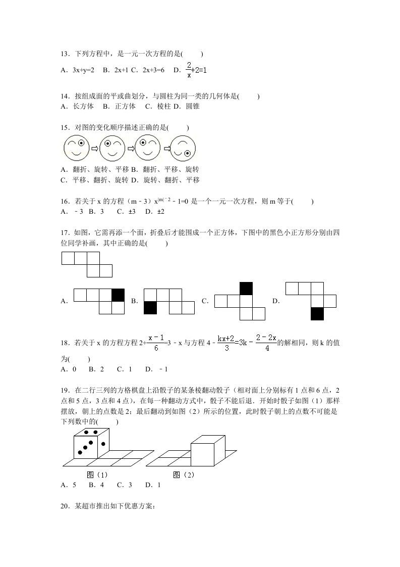 2015-2016学年江苏省镇江实验中学七年级(上)月考数学试卷(12月份)一、填空题(每题2分,合计24分)1.己知x=2是关于x的方程2x-k=1的解,则k的值是2.若单项式-名x+2y与42y是同类项,则m33.夜晚的流星划过天空时留下一道明亮的光线,由此说明了的数学事实.4.一个棱锥有4个面,它有个顶点,条棱。5.圆柱的侧面展开图是,圆锥的侧面展开图6.请写出一个主视图、左视图和俯视图完全一样的几何体7.己知某个一元一次方程的未知数的系数是2,并且该方程的解是3,写出一个符合上述条件的方程8.当x=时,代数式5x+2与-2x+7互为相反数.9.如图是一个长方体的展开图,每个面上都标注了字母,如果F面在前面,B面在左面,(字母朝外),那么在上面的字母是ABD10.儿子今年11岁,父亲今年39岁,年后,父亲的年龄是儿子的年龄的3倍.11.一项工程,甲独做需15小时完成,乙独做需10小时完成,先由甲、乙两人合做一段时间,后面的部分由甲花了5小时单独完成.则甲、乙合做的时间是小时.12.我们知道,。=1-,1=1-.1=1-11×222×323,n×(t1)nnt1(n是正整数):则一元一次方程受+骨号+2014文20152014的解为二、选择题(每题3分,合计24分)