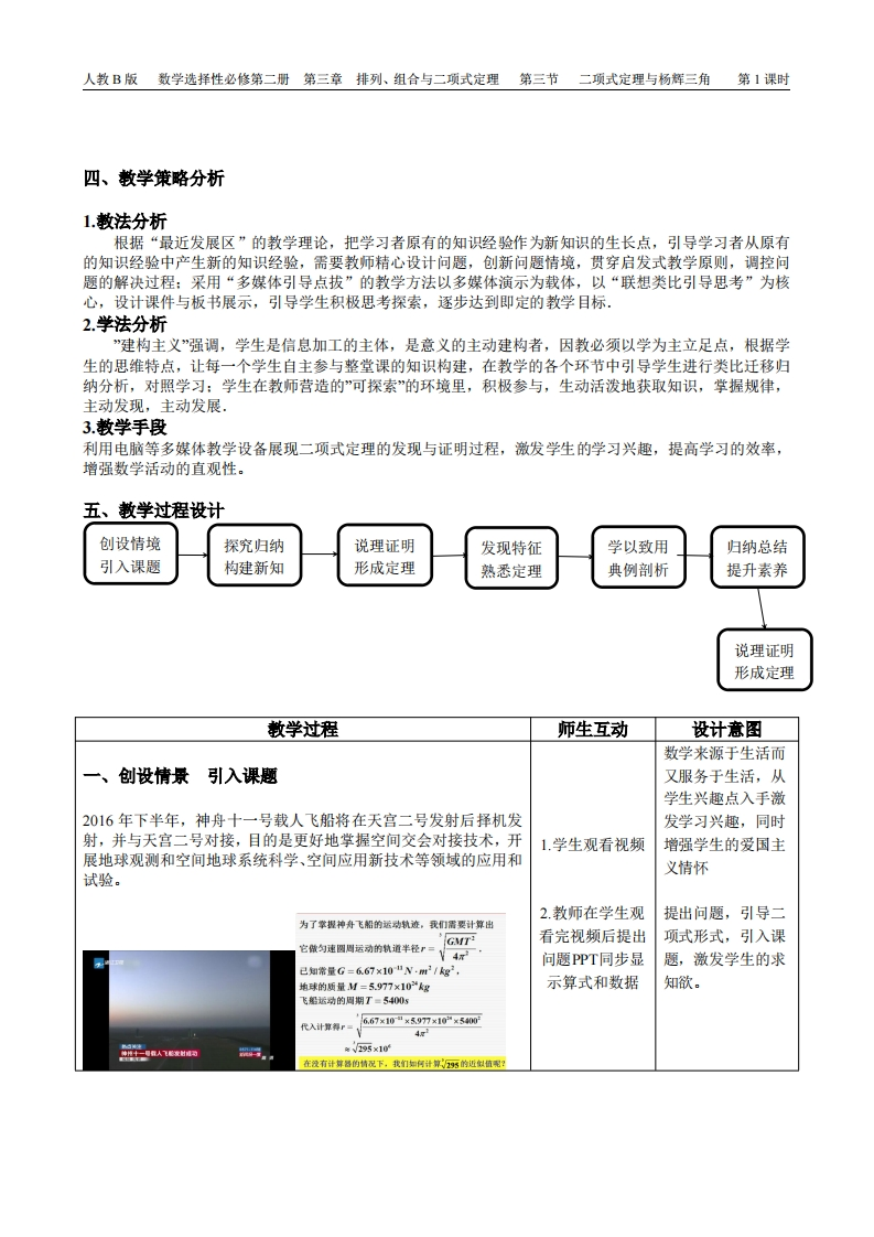 人教B版数学选择性必修第二册第三章排列、组合与二项式定理第三节二项式定理与杨辉三角第1课时《二项式定理与杨辉三角》(第一课时)教学设计一、教学内容解析“二项式定理”是人教B版《普通高中课程教科书数学(选择性必修第二册)》第三章第三节知识内容,它是初中多项式乘法的继续和高中计数原理的应用,同时也是高中学习数学期望等内容的基础,因此二项式定理起着承上启下的作用。另外,二项式系数是一些特殊的组合数,利用二项式定理又可以进一步加深对组合数的认识。总之,二项式定理是综合性比较强的,具有联系不同知识内容的作用。本节课要在用计数原理解决预设问题的基础上,得出二项式定理的猜想,并用计数原理给出证明.二、教学目标设置1.知识与技能:学生在二项式定理的发现推导过程中,掌握二项式定理及推导方法、二项展开式、通项公式的特点,会利用二项展开式及通项公式解决有关问题.2.过程与方法:学生经历二项式定理的探究过程,体验“从特殊到一般发现规律,从一般到特殊指导实践”的思想方法,获得观察、归纳、类比、猜想及证明的理性思维探究能力·3.情感、态度与价值观:通过二项展开式的探究,培养学生积极主动、勇于探索、不断创新的精神,感受合作探究的乐趣,感受数学内在的和谐、对称美及数学符号应用的简洁美.结合数学史,激发学生爱国热情和民族自豪感。三、学生学情分析知识储备:学生初中学习过多项式乘法法则,并且刚刚学习了计数原理和排列组合知识,对本节课分析(ā+b)”展开式结构以及利用计数原理分析项的系数提供了帮助,同时授课学生为高二学生,有着一定的归纳推理能力,分析转化问题的能力。存在问题:本节课思维含量比较大,对思维的严谨性和逻辑推导能力以及分类讨论,归纳推理能力等有着很高的要求,需要学生利用多项式乘法法则归纳乘积项的结构,并能利用计数原理分析项的系数,学生学习起来有一定难度。而且学生在学数学过程中,往往只习惯于重视定理、公式的结论,而不重视推导过程,这都为本节课的教学带来了难度。根据以上学情,制定如下教学重难点:散学重难点:如何让学生想到利用计数原理去分析二项展开过程:如何发现二项式展开成单项式之和时各项系数的规律:用计数原理分析的(a+b)“展开式,得到二项式定理.