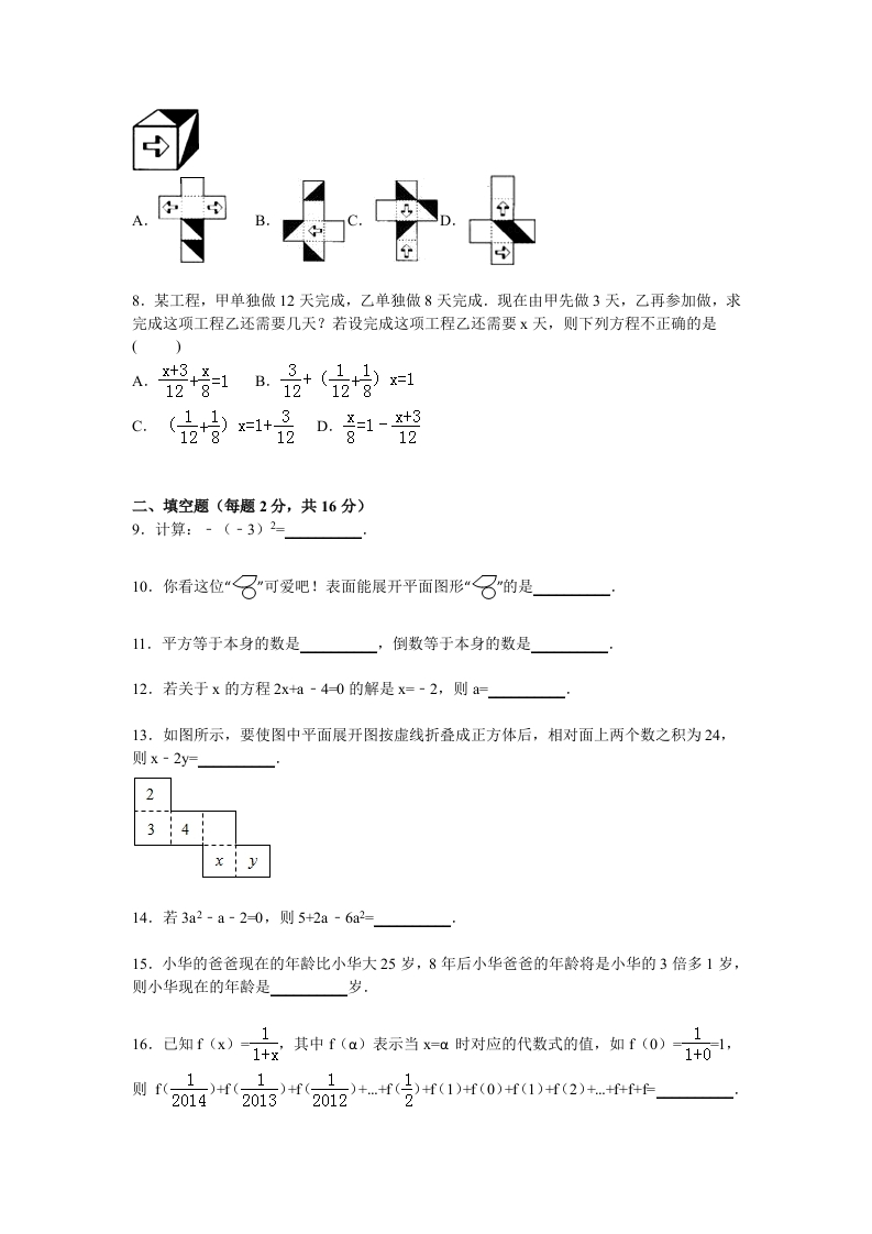 2015-2016学年江苏省镇江市丹阳市里庄中学七年级(上)第二次月考数学试卷一、选择题(共8小题,每小题3分,满分24分)1.-6的相反数是()A.-6B.6C.-D.62.在方程xy2,x-20,高空22x30中一元一次方程的个数)A.1个B.2个C.3个D.4个3.2013年1月13日,我市首座智能变电站“合南变电站"建成投运,总投资约有41620000元.这个数据用科学记数法表示约为()A.416×105B.41.6×10°C.4.16×107D.0.416×10834.若单项式-5xy的系数为m,次数为n,则m+n()2A昌9cD.45.下图中的图形绕虚线旋转一周,可得到的几何体是()、6。下面是一个被墨水污染过的方程:2x合3X+得,答案显示此方程的解是X=-1,被墨水遮盖的是一个常数,则这个常数是()A.1 B.1 C.D.7.将如图的正方体展开能得到的图形是(